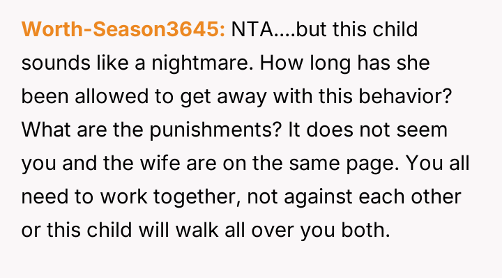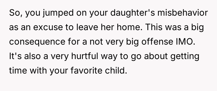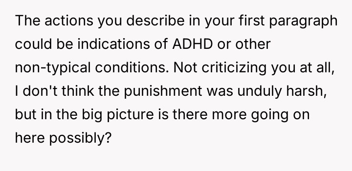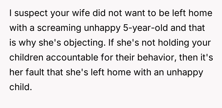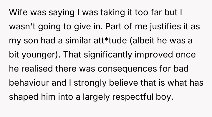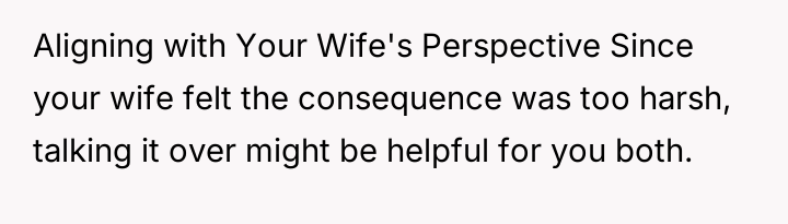 This action directly conflicted with the wife's perception that the parent took the discipline too far, highlighting a disagreement over the severity and m**hod of consequence application in response to routine childhood defiance.