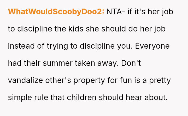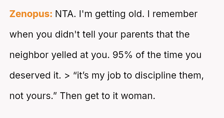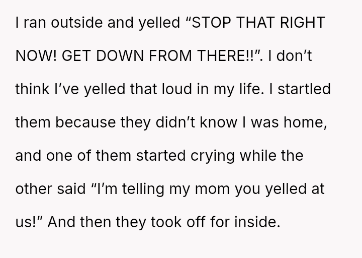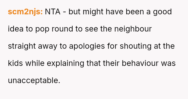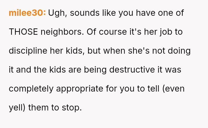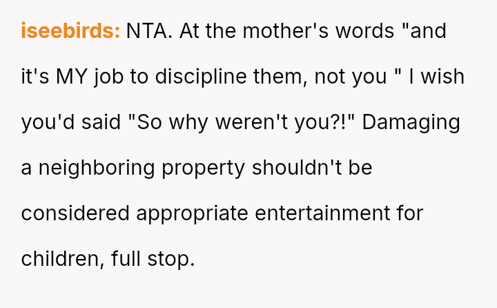 The central conflict arises from the OP's need to protect their property versus the neighbor's belief that the children were harmlessly pa*sing time and that only the parent has the right to enforce discipline.
