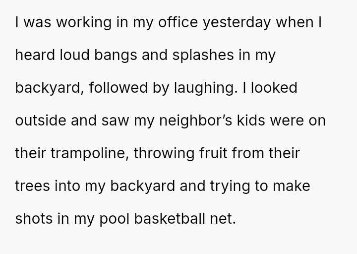 In the quiet of a seemingly ordinary day, the serenity of one person’s backyard was shattered by the chaos of childhood unleashed—loud bangs, splashes, and the careless laughter of neighbor’s kids turning a peaceful pool into a messy battleground.