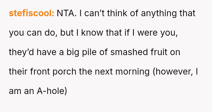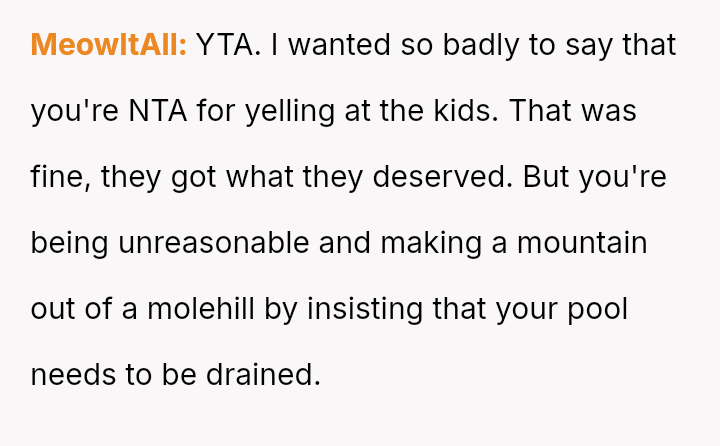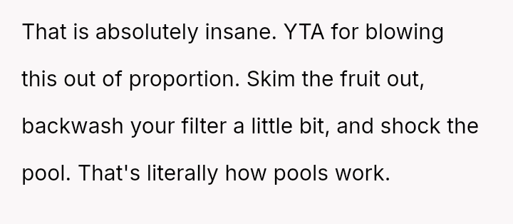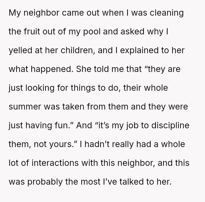 The original poster (OP) reacted strongly to finding neighborhood children damaging their property by throwing fruit into their pool, leading to a confrontation.