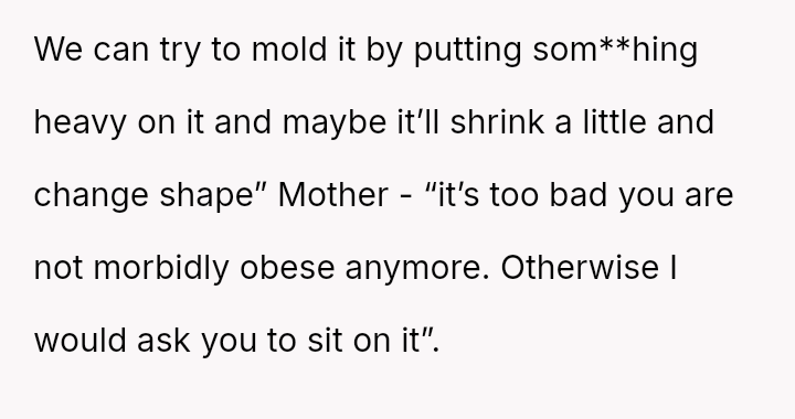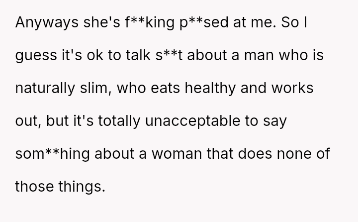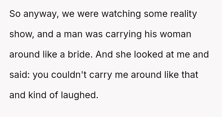 The original poster (OP) feels hurt and disrespected because his wife frequently criticizes his physique, suggesting he needs to gain weight, while simultaneously reacting angrily when he makes a similar, though provoked, comment about her ability to be carried like on television.