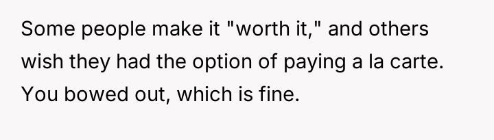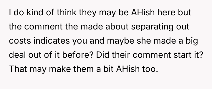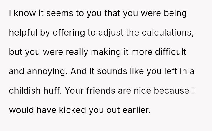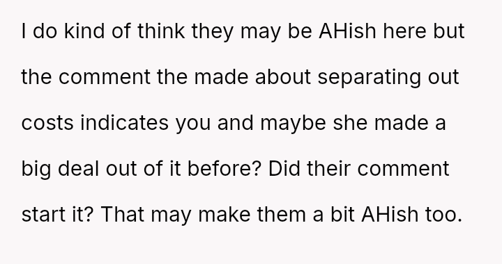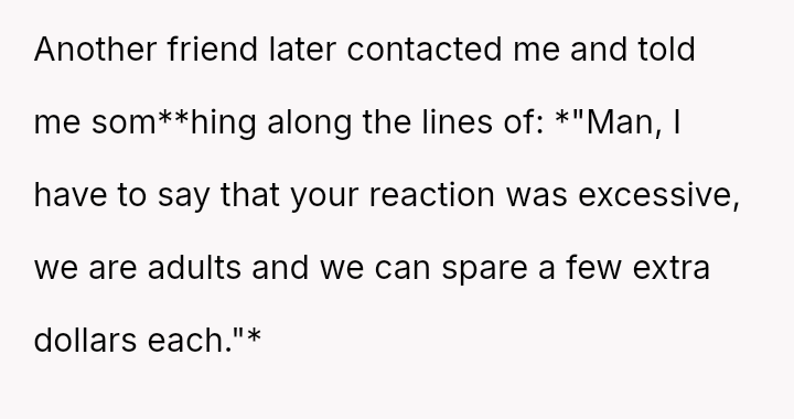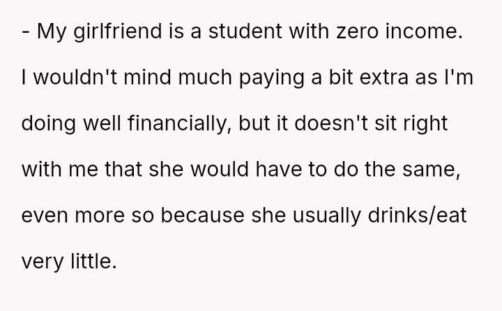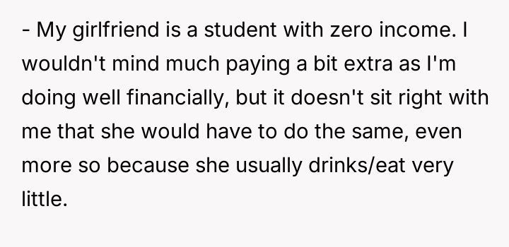 Conversely, was the organizer justified in enforcing an equal split for simplicity, or did his subsequent action of kicking the girlfriend represent an inappropriate power move against a legitimate objection?