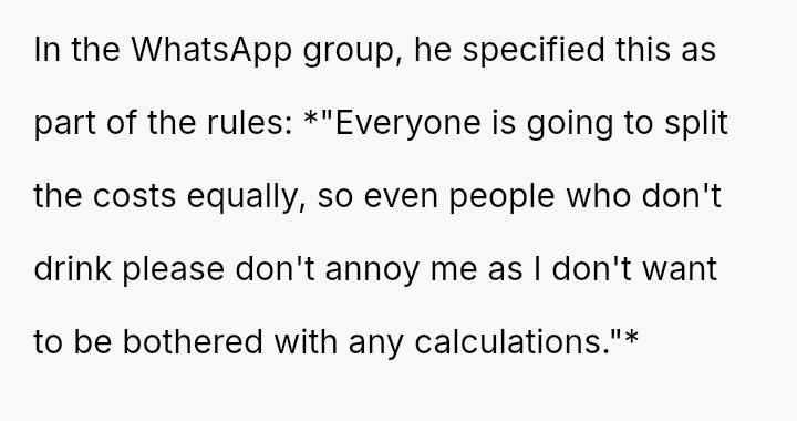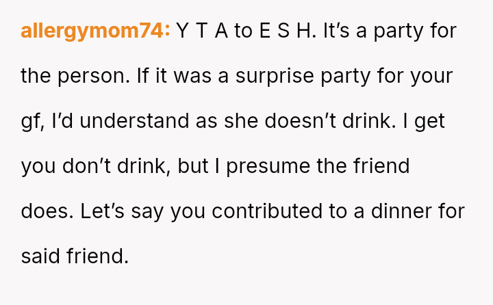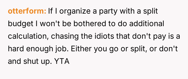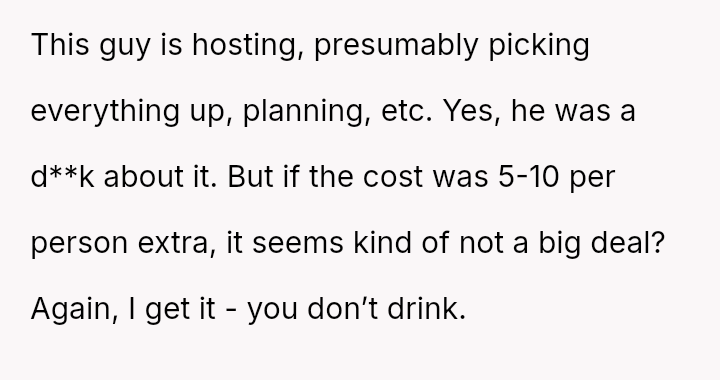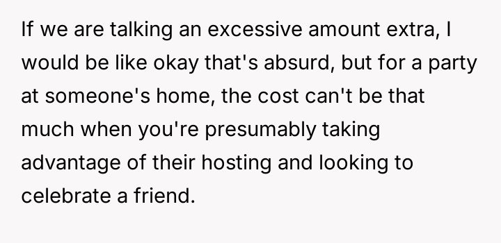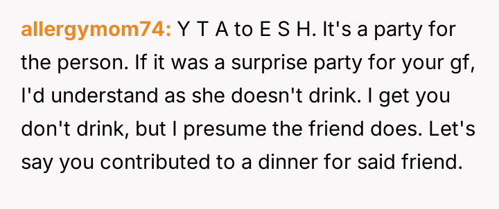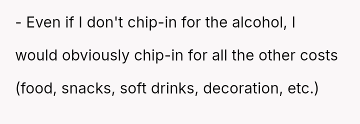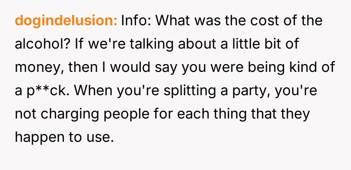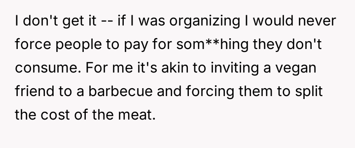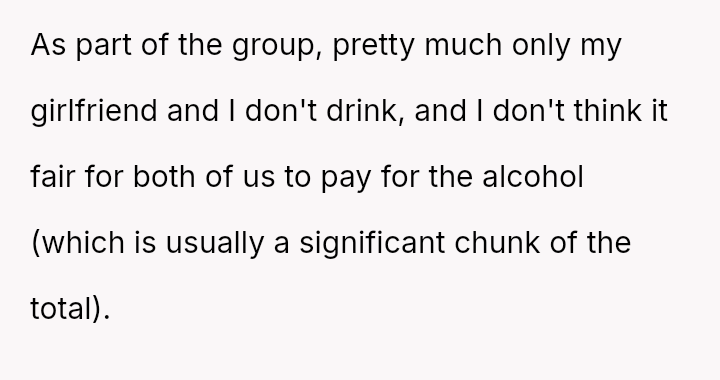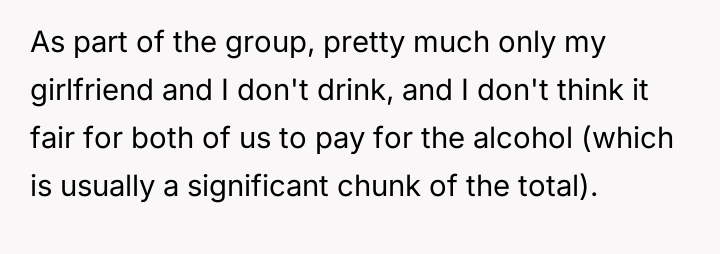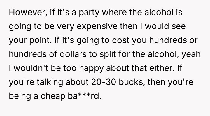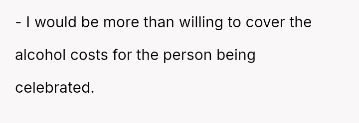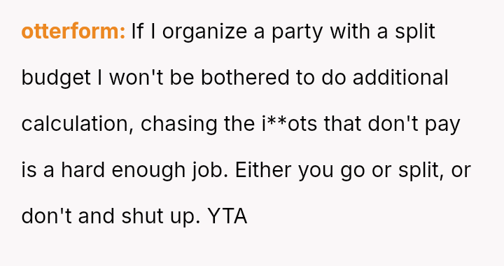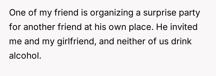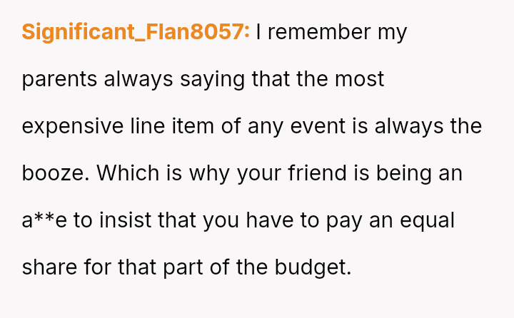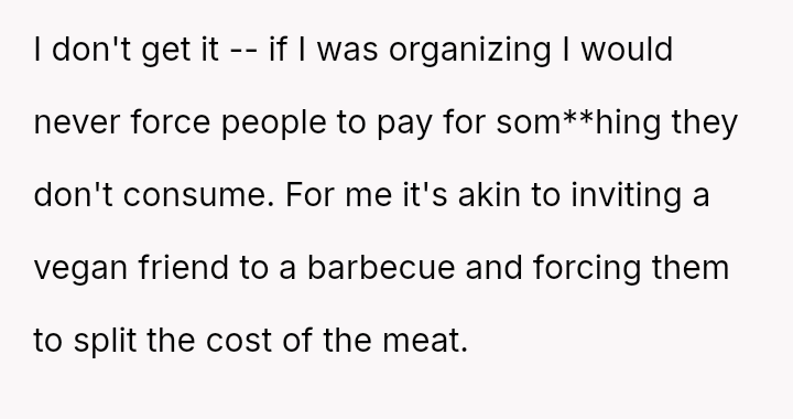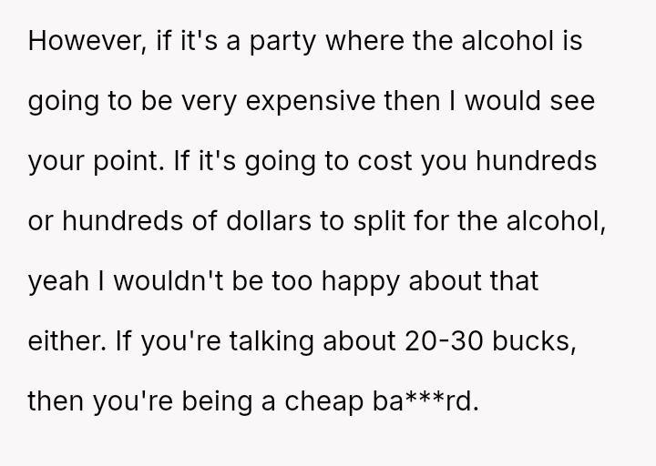 The original poster (OP) experienced significant conflict when the party organizer insisted on an equal cost split for a surprise party, including mandatory contributions toward alcohol consumption, despite the OP and his girlfriend not drinking.