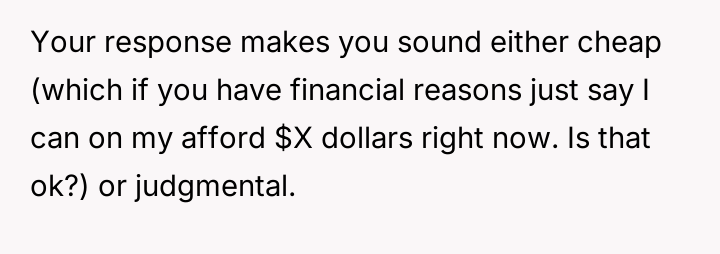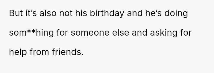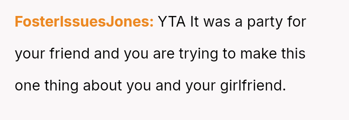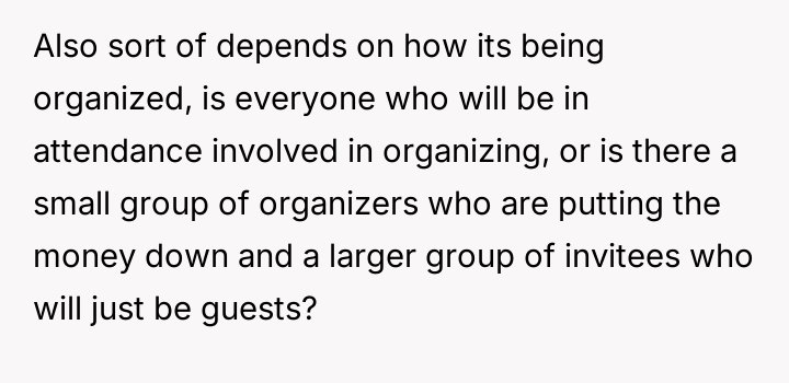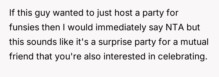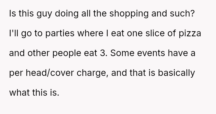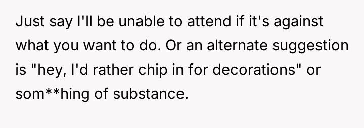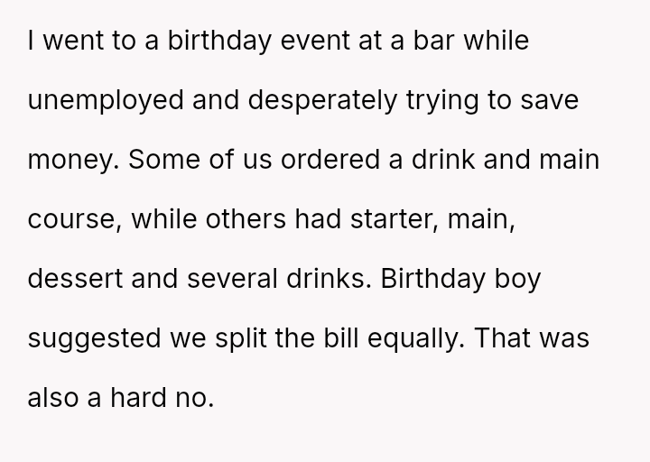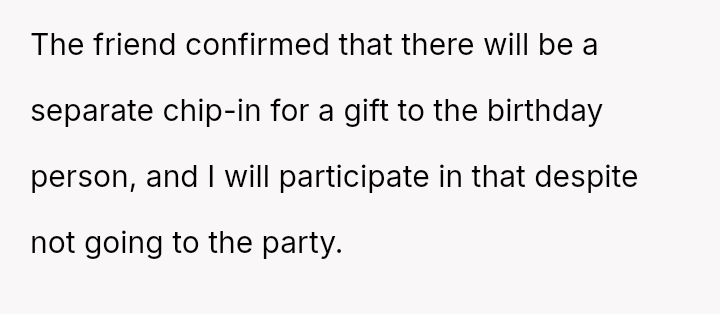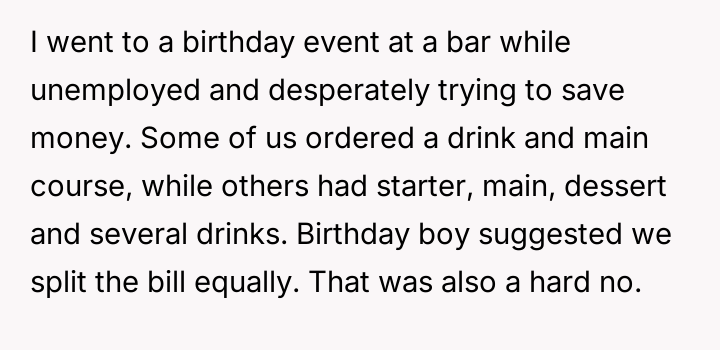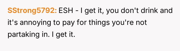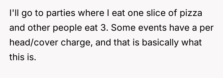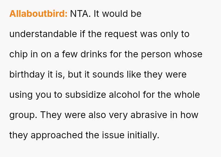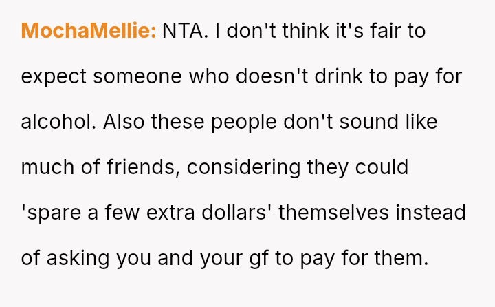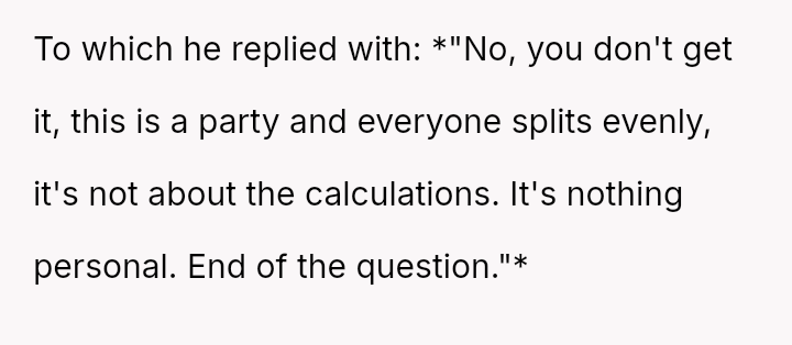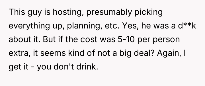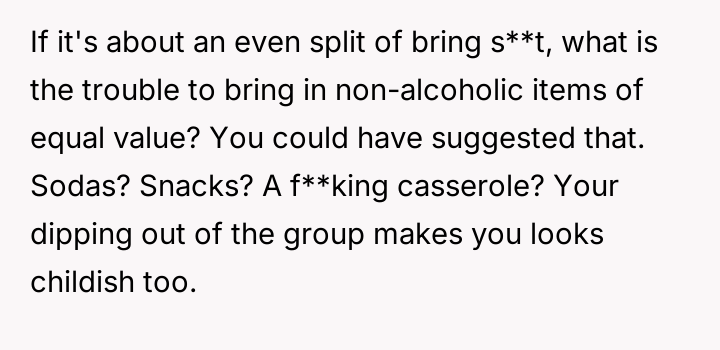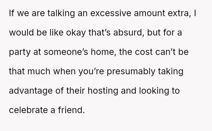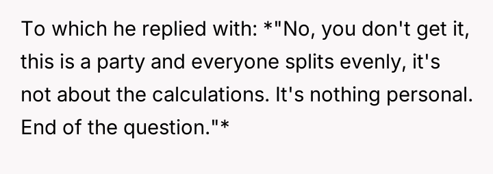 The original poster (OP) experienced significant conflict when the party organizer insisted on an equal cost split for a surprise party, including mandatory contributions toward alcohol consumption, despite the OP and his girlfriend not drinking.
