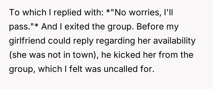 The OP prioritized his belief in fairness regarding consumption versus cost, leading him to refuse participation and exit the planning group, which escalated the situation when the organizer subsequently removed his girlfriend from the chat.