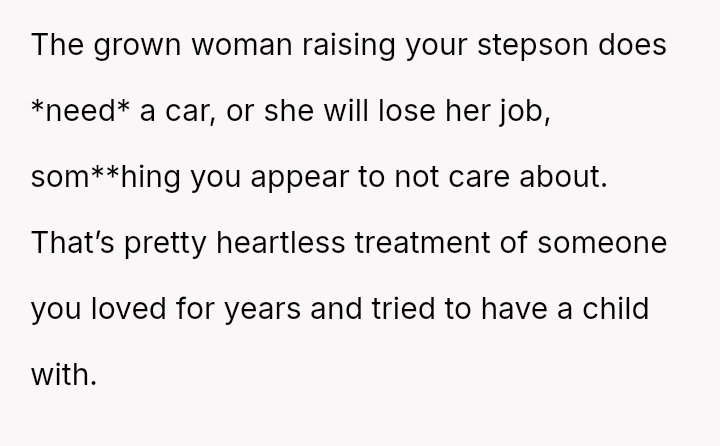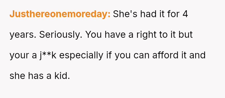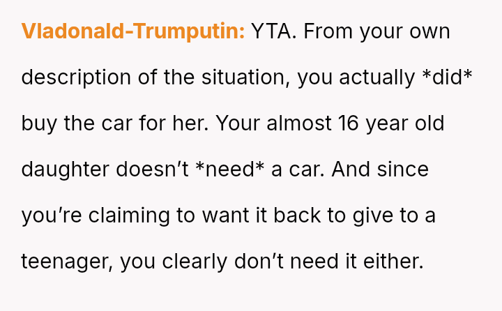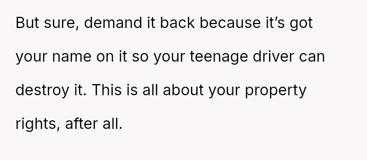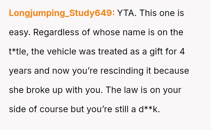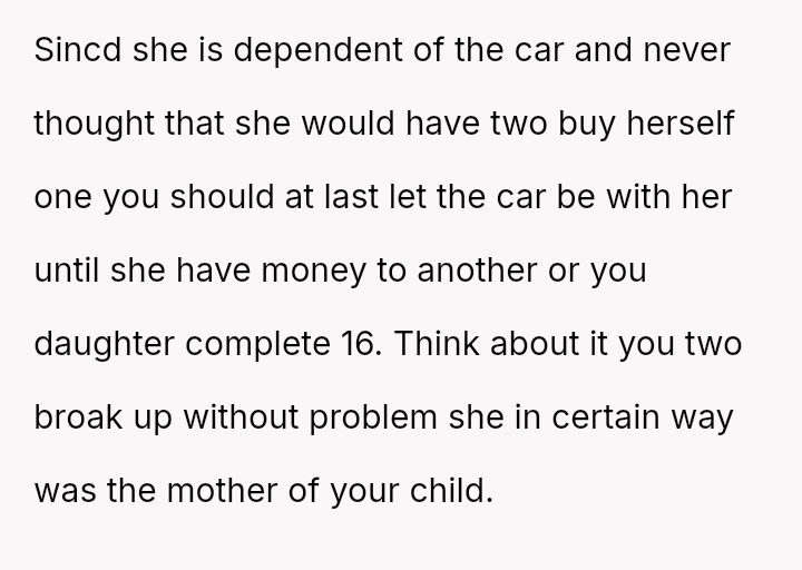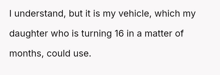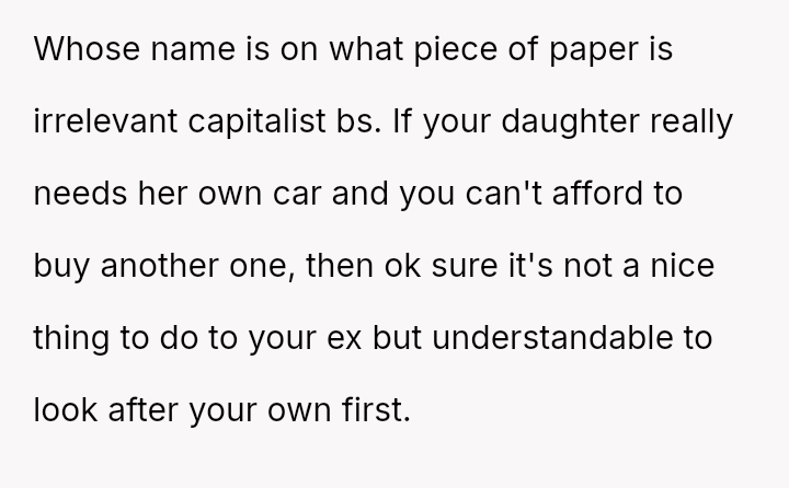The OP feels justified in reclaiming his property to serve his own family's needs, particularly his upcoming-to-drive daughter, while the ex-partner relies on the vehicle for financial s**bility and work.