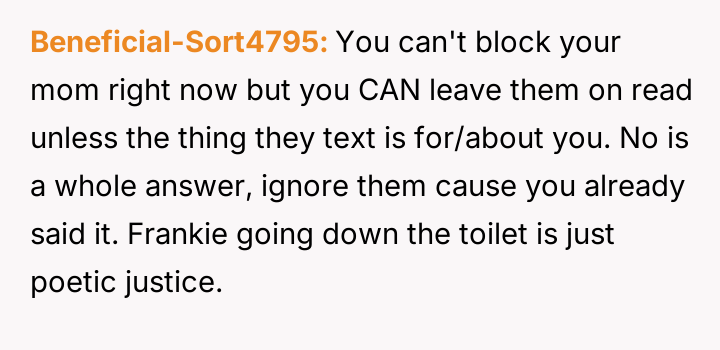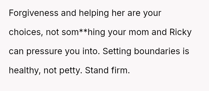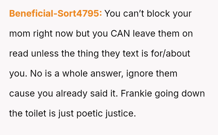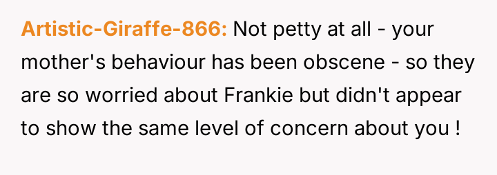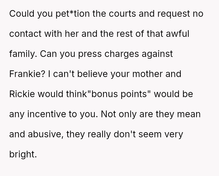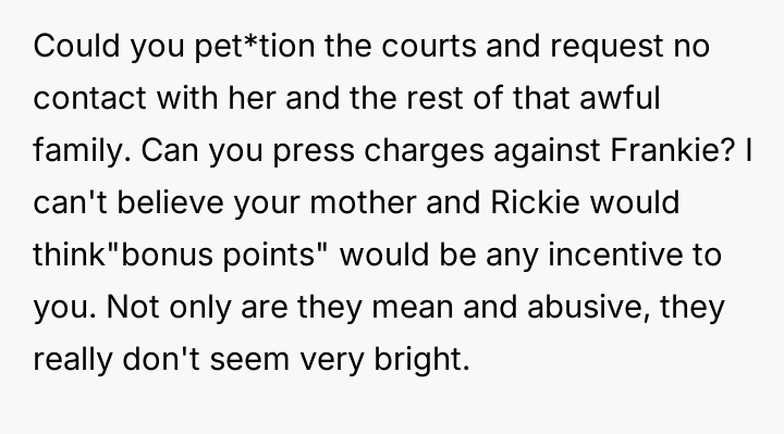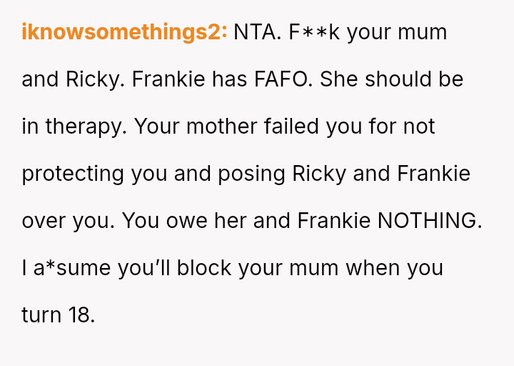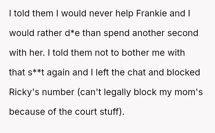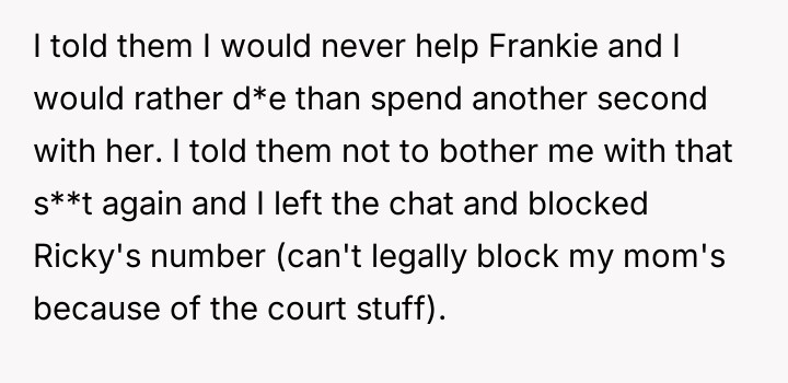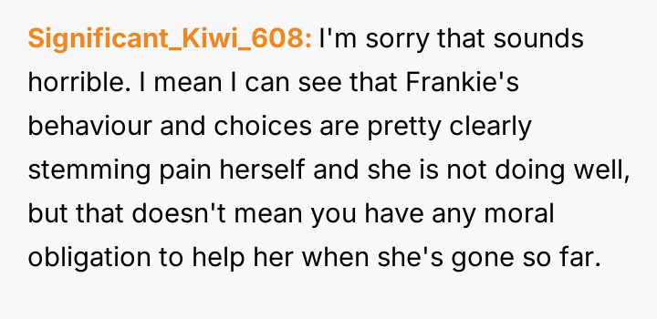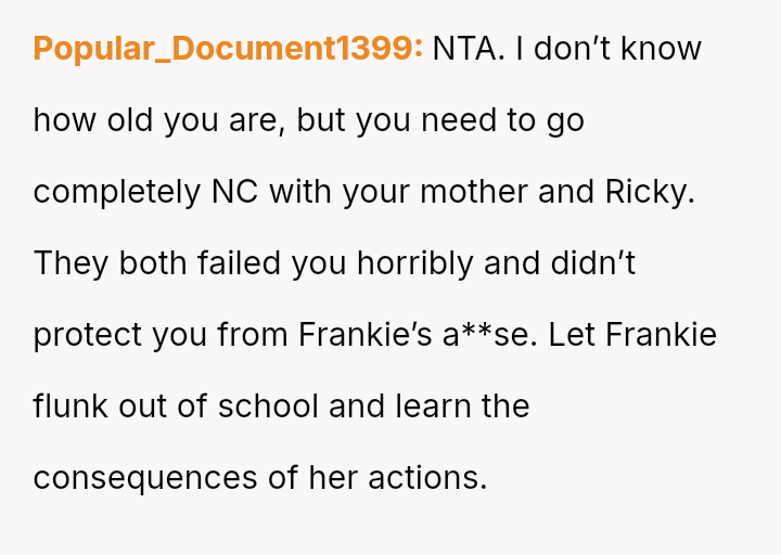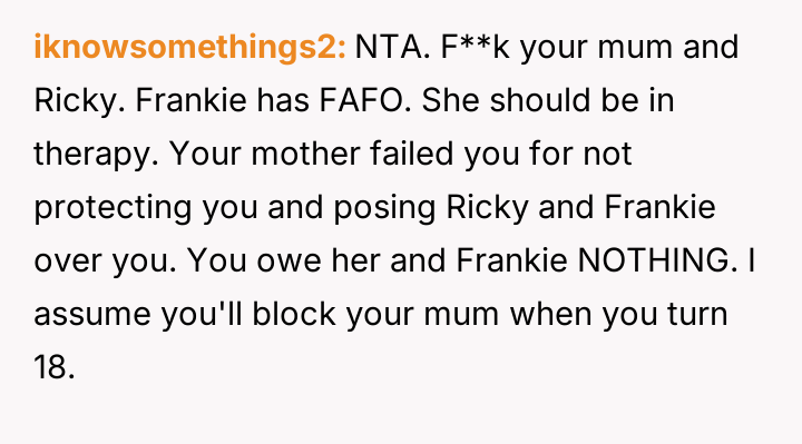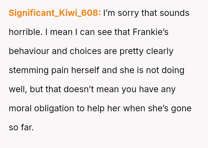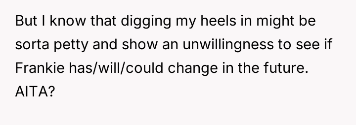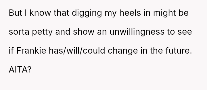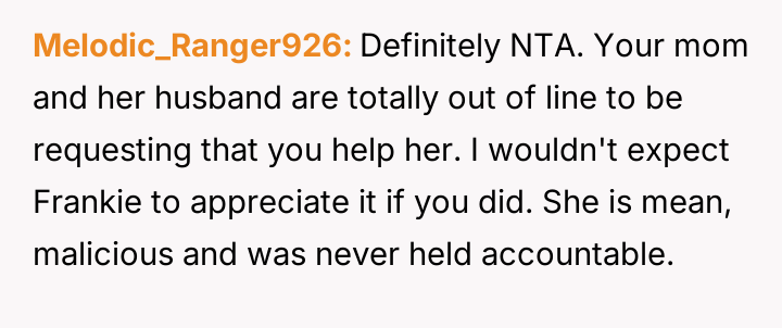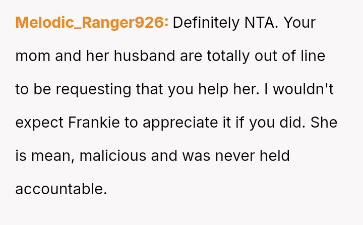 Given the history of physical danger and emotional neglect by the mother, is the OP justified in flatly refusing to help their former a**ser, or is their refusal an unfair roadblock to the family's desire for reconciliation and Frankie's academic future?