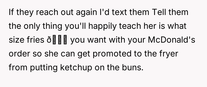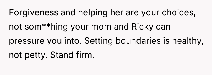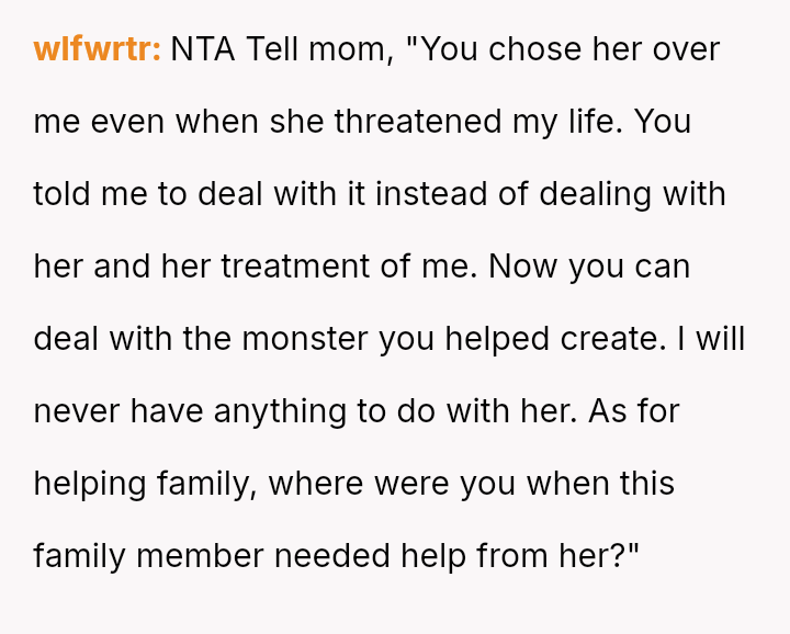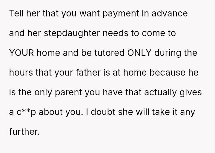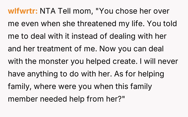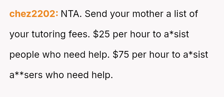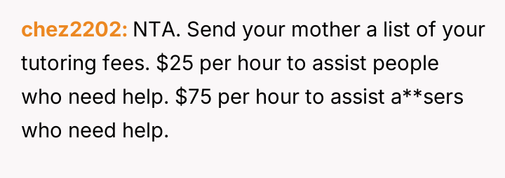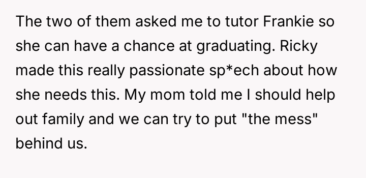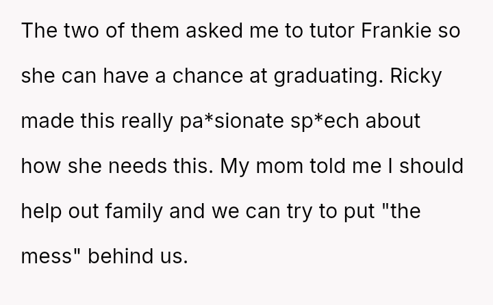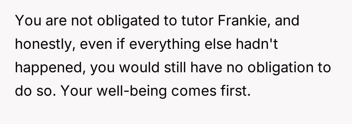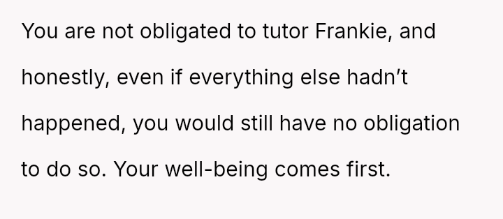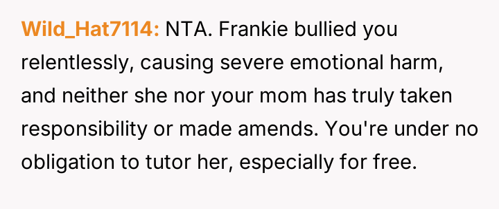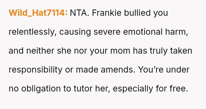Despite the mother's efforts to force reconciliation by demanding free tutoring for the former bully, the OP remains unwilling to engage, prioritizing their own past trauma over the imposed family narrative.