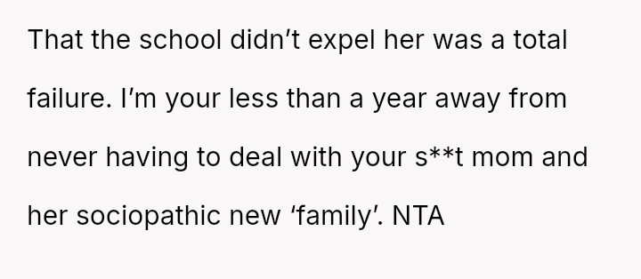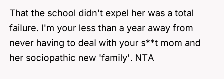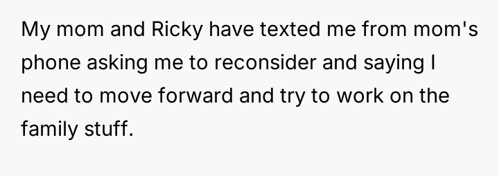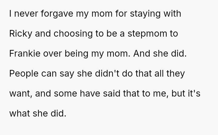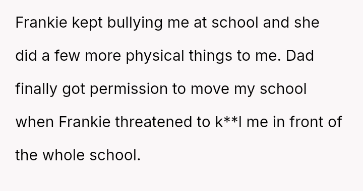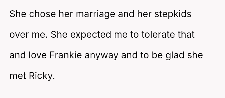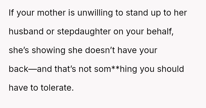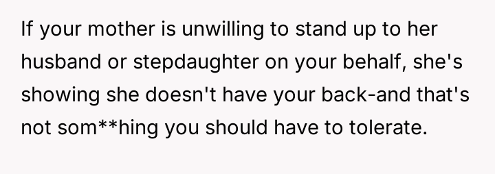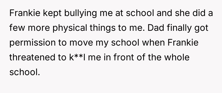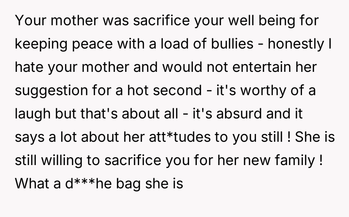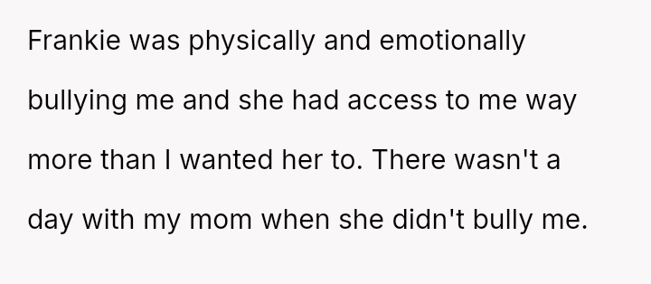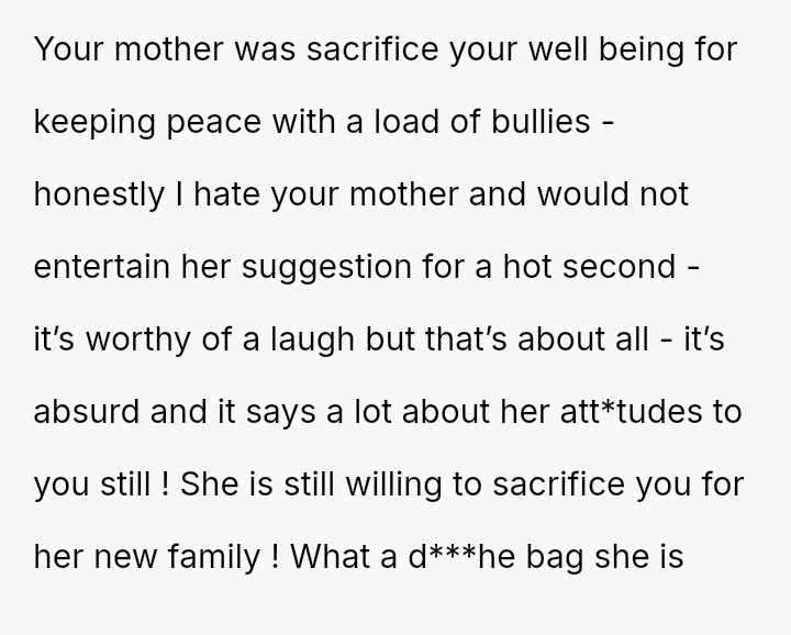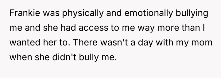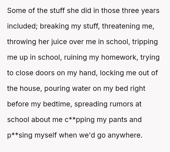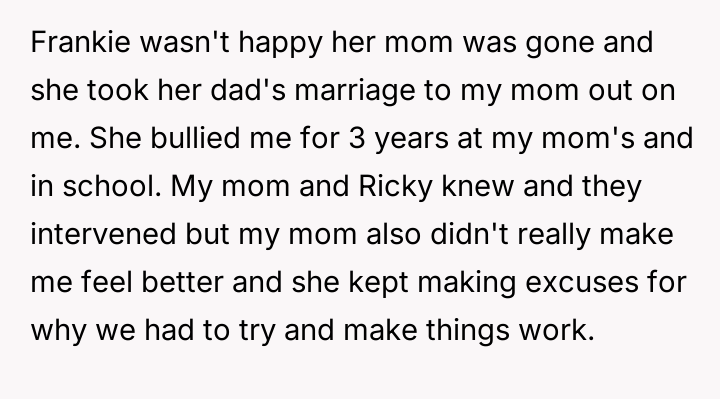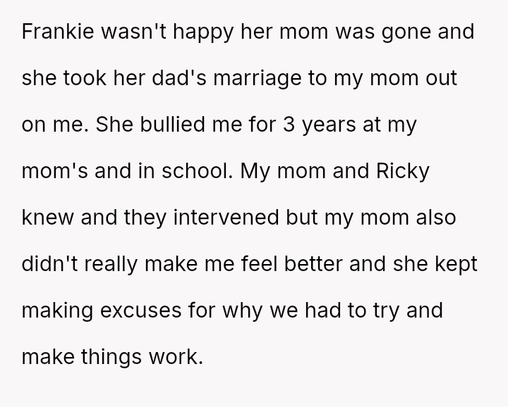 The original poster (OP) is dealing with the long-term emotional damage caused by severe bullying from a stepsister, which their mother minimized and accepted as a necessary hurdle for family unity.