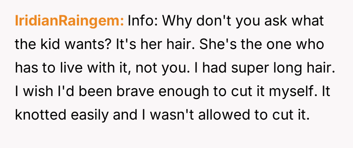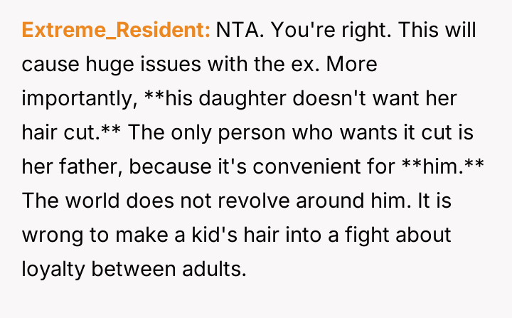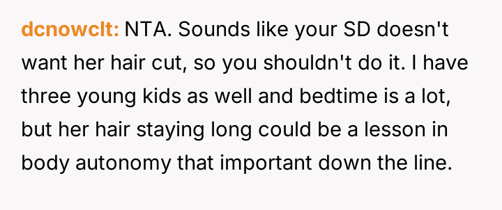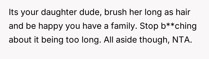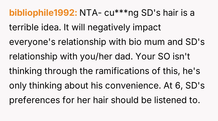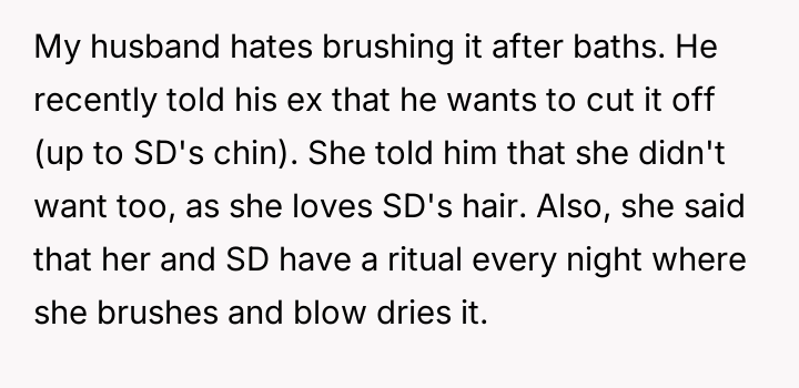 The original poster (OP) is facing conflict between supporting their husband's desire for an easier hair care routine for their stepdaughter and maintaining peace with the child's mother, who values the long hair and the nightly bonding ritual associated with it.