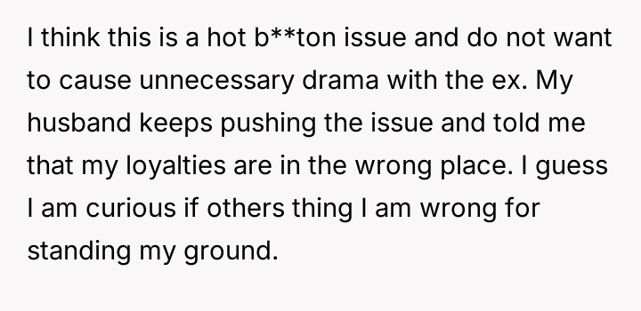 The OP's hesitation stems from concern over escalating co-parenting tension, while the husband insists the OP's loyalty should prioritize his comfort and unilateral decision-making regarding the child during their custody time.