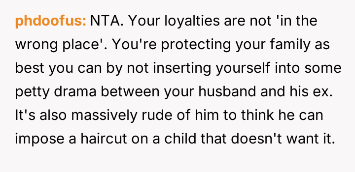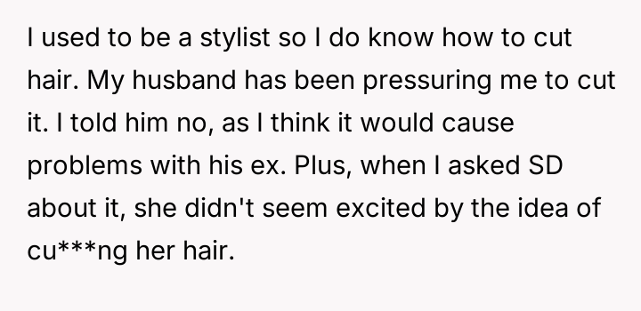 Is the OP correct to refuse cu***ng the stepdaughter's hair against the wishes of the child's mother and the child's own apparent lack of enthusiasm, or should the OP prioritize their husband's demand for convenience, even if it risks significant conflict with the ex-wife?