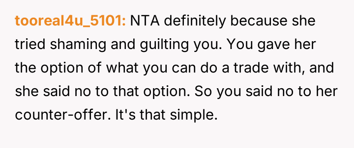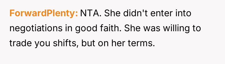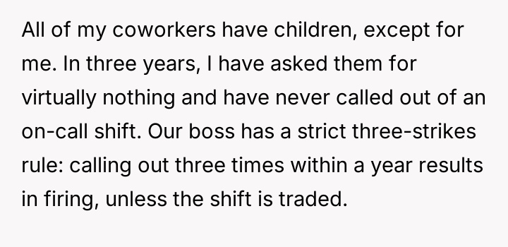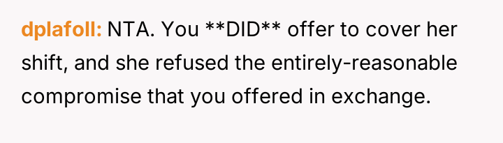 Considering the OP's es**blished pattern of reliability versus the coworker's immediate crisis, was the OP obligated to offer assistance without demanding an immediate, equivalent trade, or was their refusal a justified defense of their personal time against repeated demands?