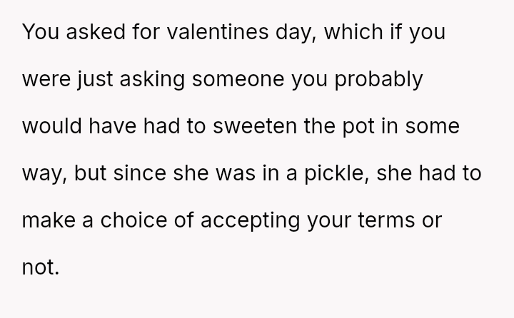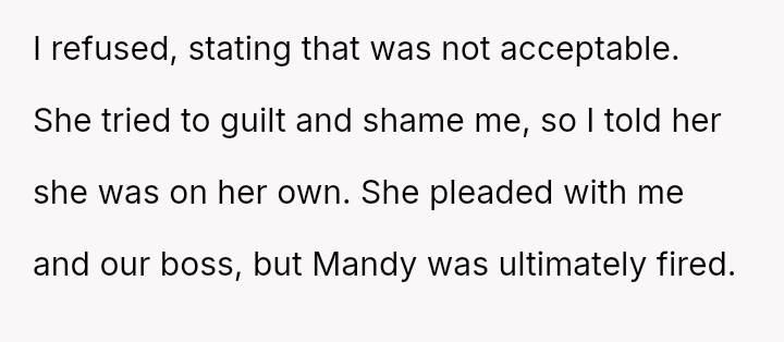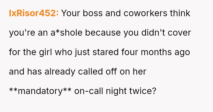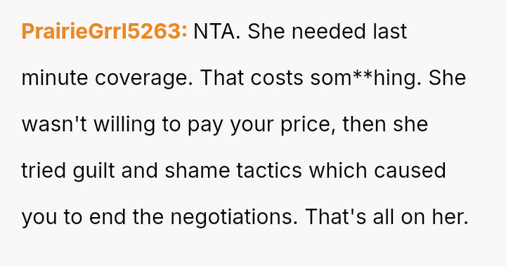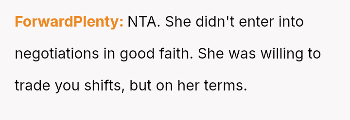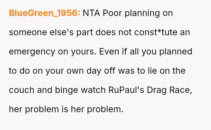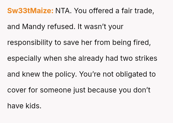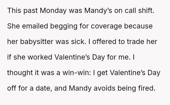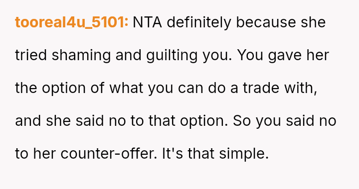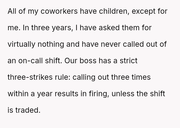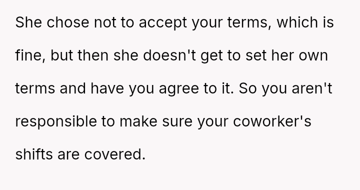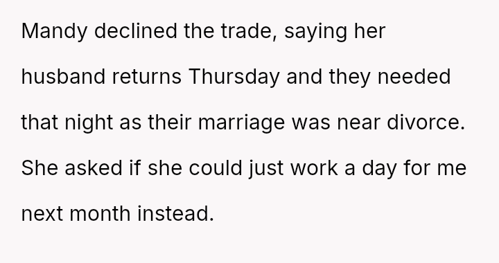 Considering the OP's es**blished pattern of reliability versus the coworker's immediate crisis, was the OP obligated to offer a*sistance without demanding an immediate, equivalent trade, or was their refusal a justified defense of their personal time against repeated demands?