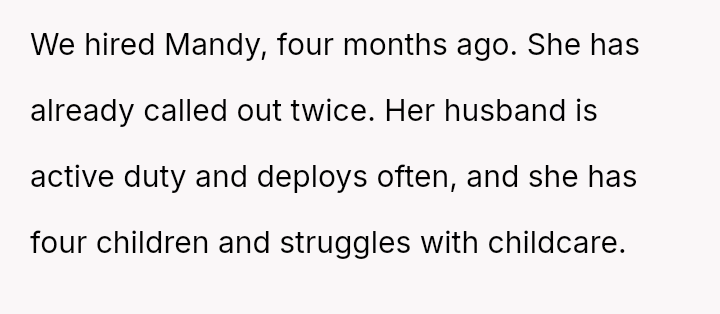 She has navigated three years of relentless dedication with unwavering reliability, never once asking for favors or calling out, while her coworkers, mostly parents, lean on each other amid the emotional weight of their work.
