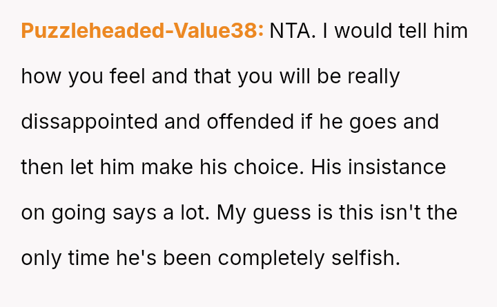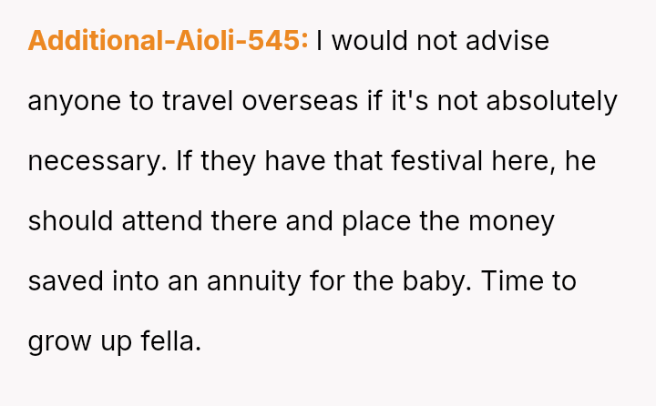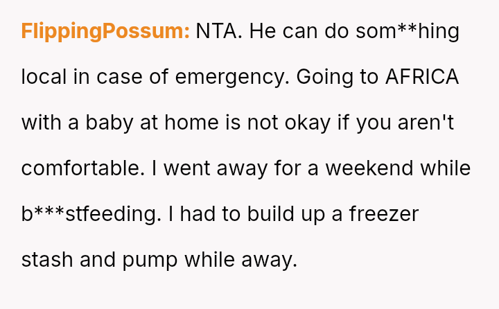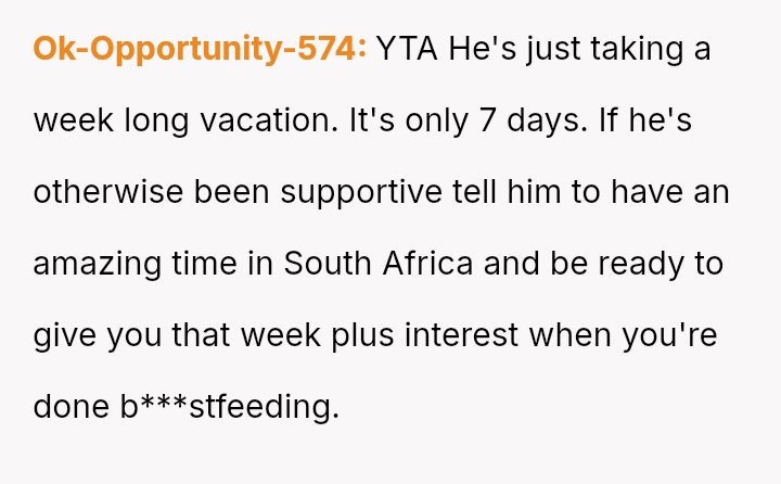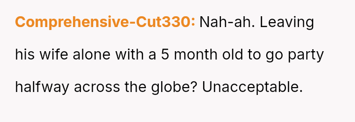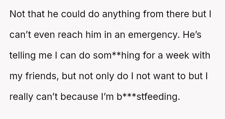 The original poster (OP) is experiencing significant distress and anxiety due to her husband's plan to attend a week-long, completely disconnected event 10,000 miles away while she is solely responsible for their five-month-old, b***stfeeding infant.