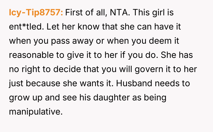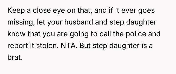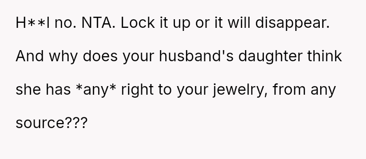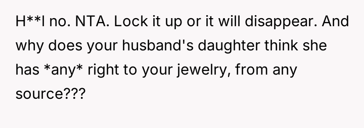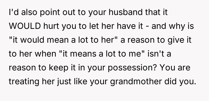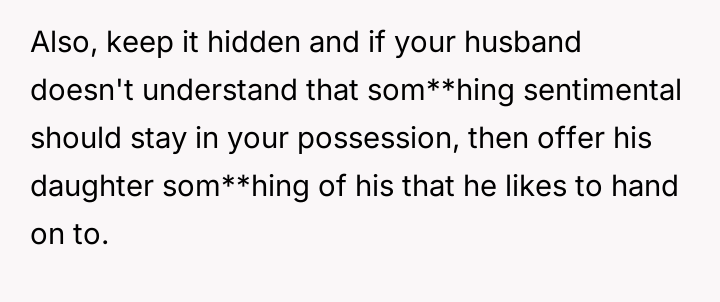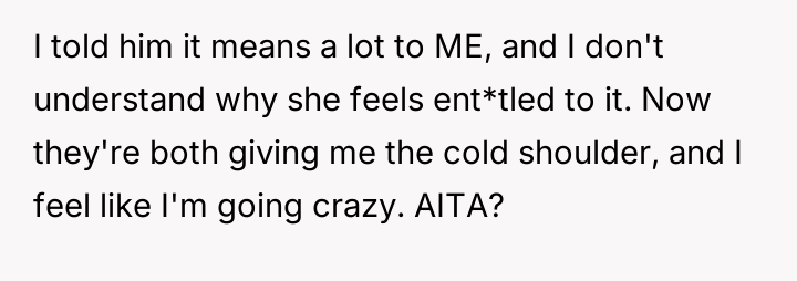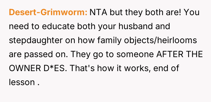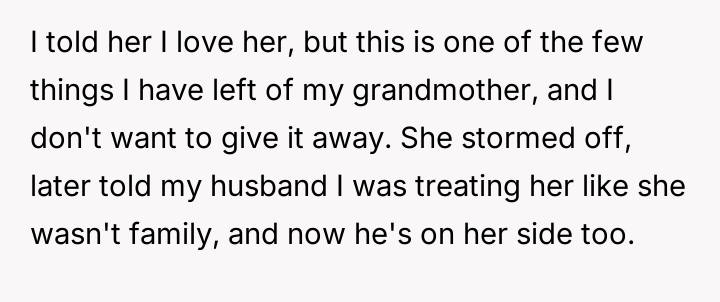The central conflict is between the OP's deeply personal attachment to the heirloom and the stepdaughter's expressed sense of ent*tlement to it, which is further complicated by the husband siding against the OP regarding this item.