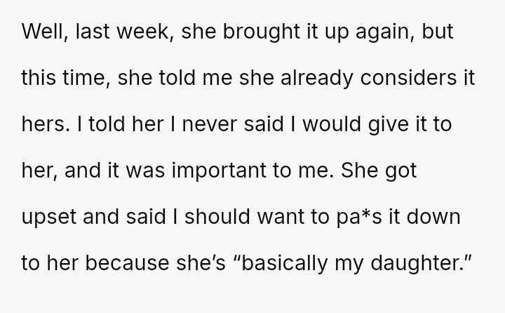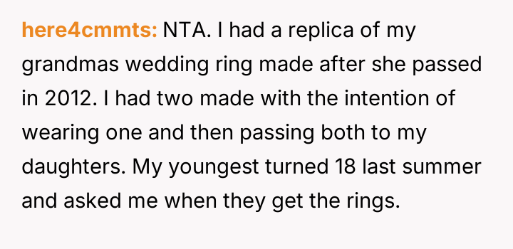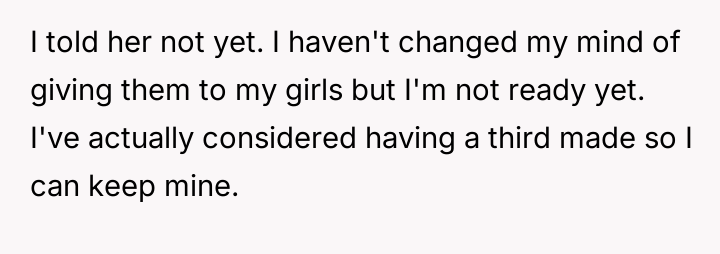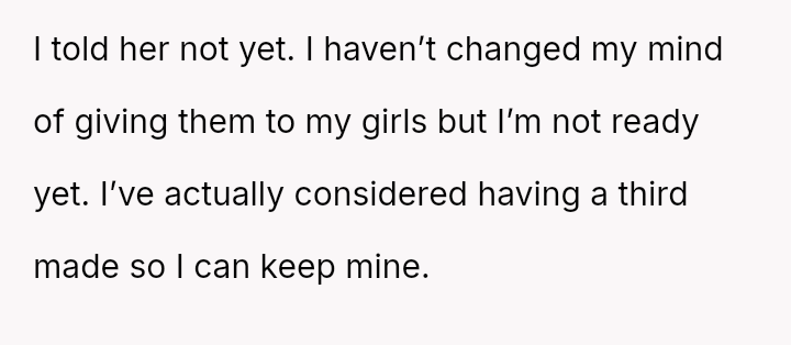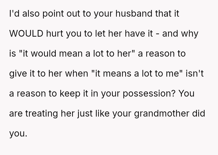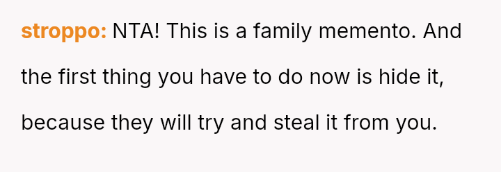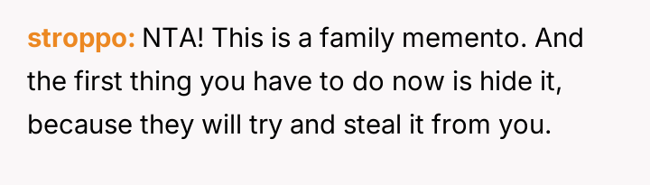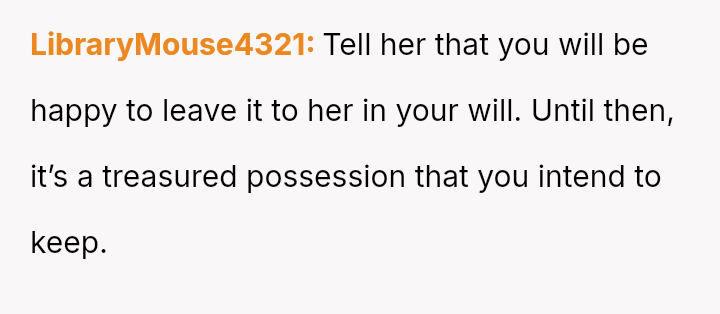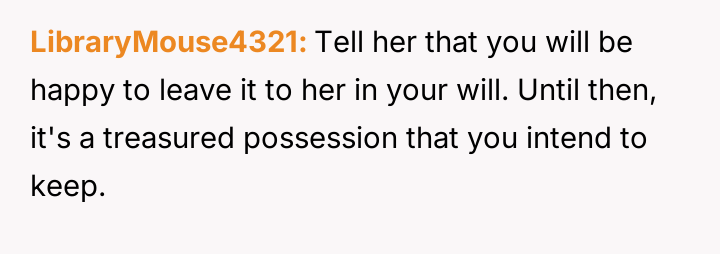 The debate centers on whether sentimental objects must yield to perceived familial obligation when a concrete promise was never made.