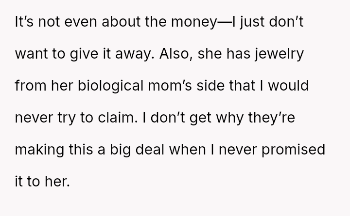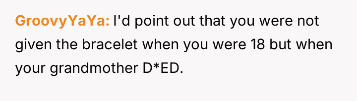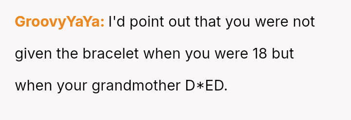 Given that the OP never explicitly promised the bracelet, is their refusal to surrender a cherished heirloom an act of self-preservation regarding personal property and memory, or is it perceived by their family as an unfair denial of a significant milestone gift, causing undue division?