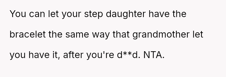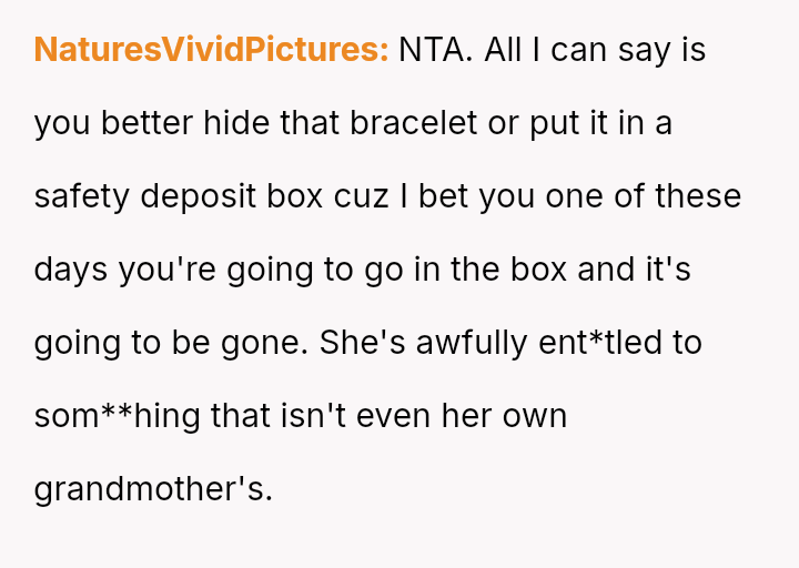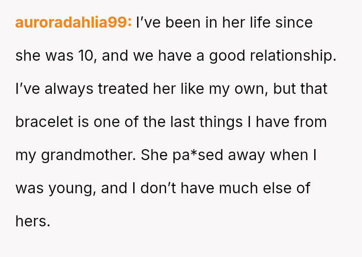 The original poster (OP) is experiencing significant emotional distress because a deeply sentimental item, a bracelet inherited from their grandmother, is the subject of a serious conflict within their family.