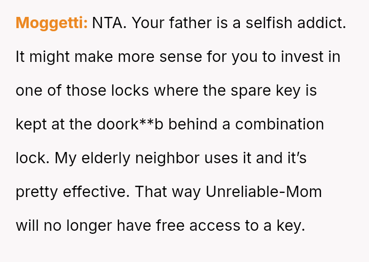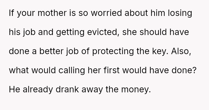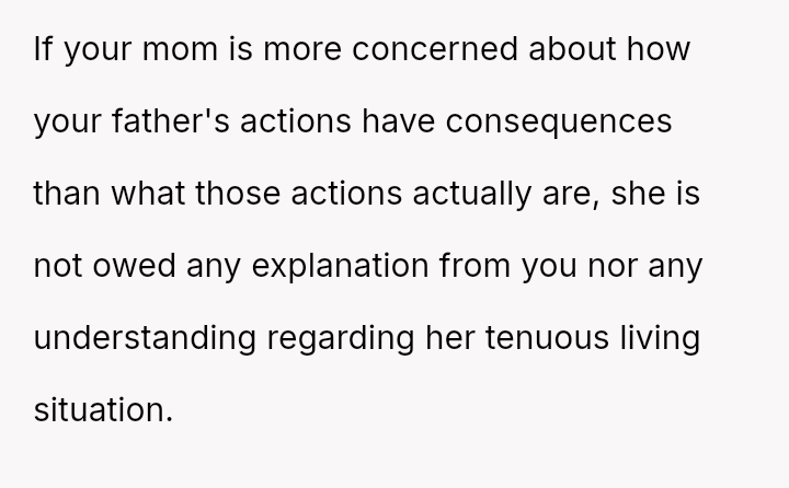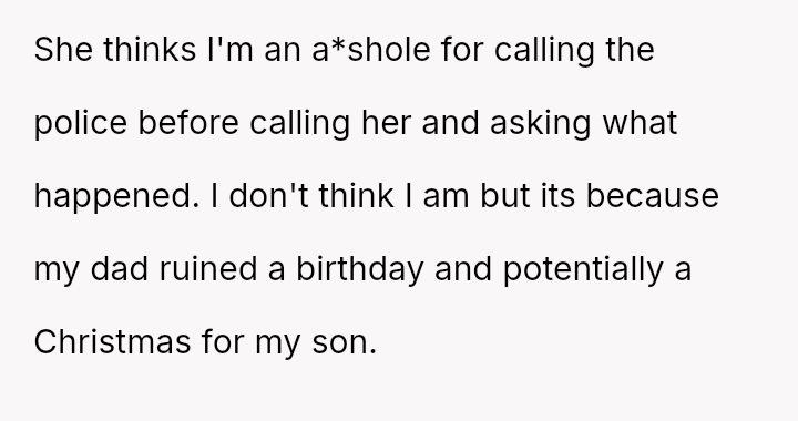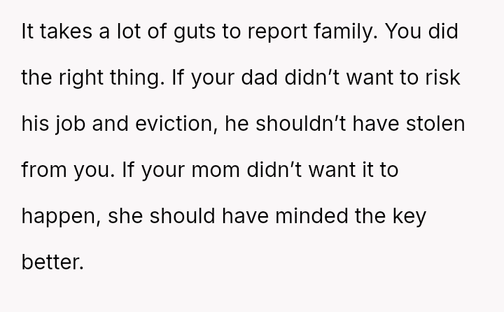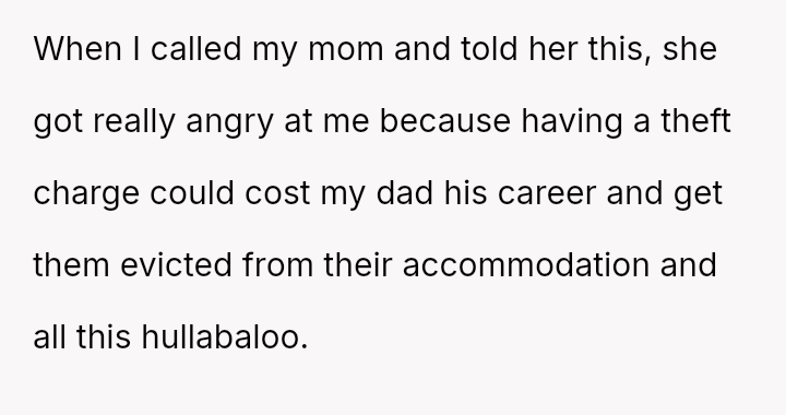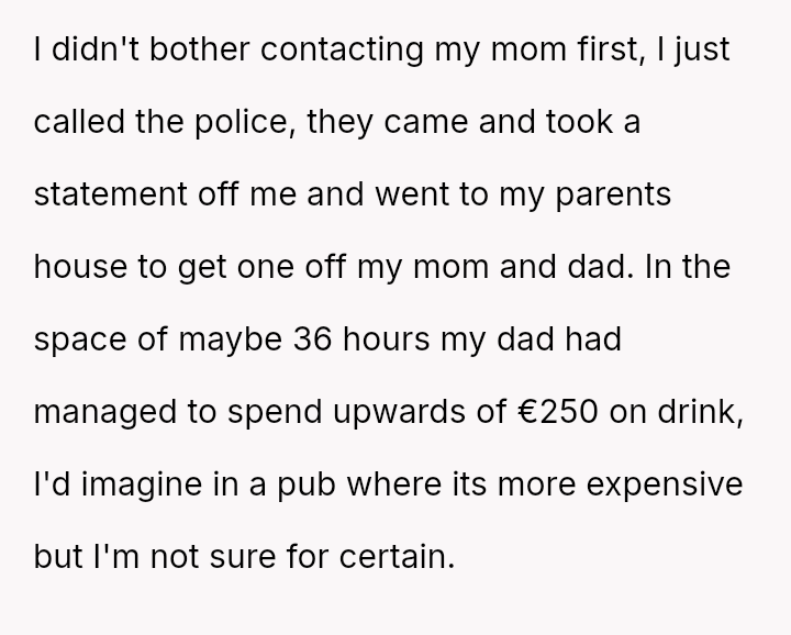 Her decision to immediately involve the police stemmed from past trauma related to her father's financial irresponsibility and addiction, conflicting sharply with her mother's desire to protect the father from legal and housing consequences.