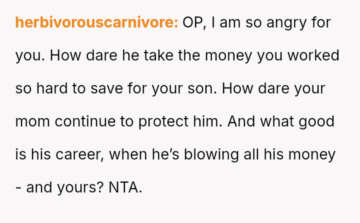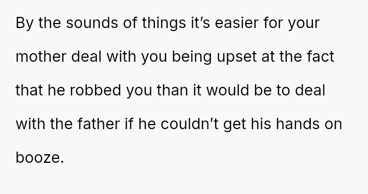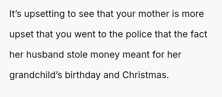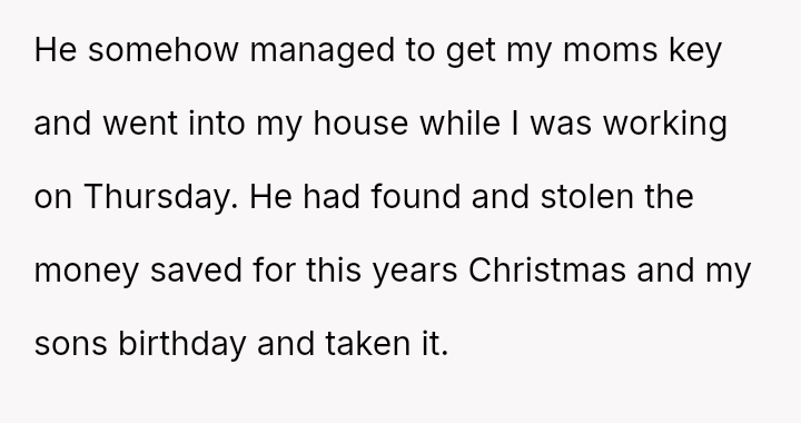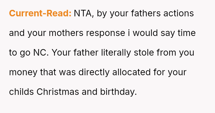 The original poster (OP) is dealing with the severe emotional impact of her father stealing essential savings intended for her son's birthday and Christmas.