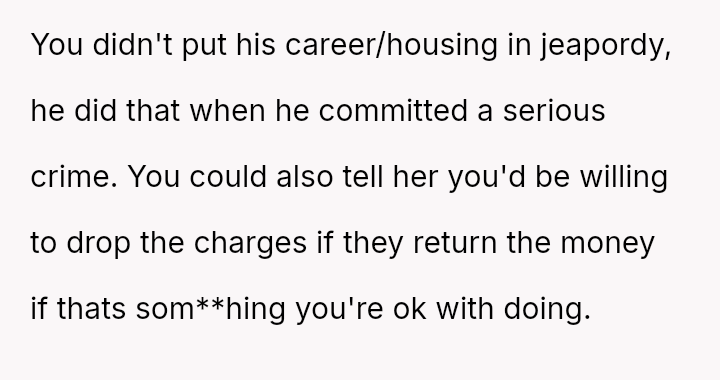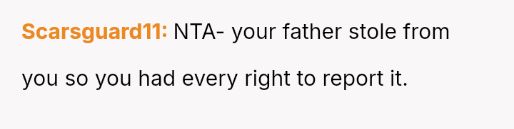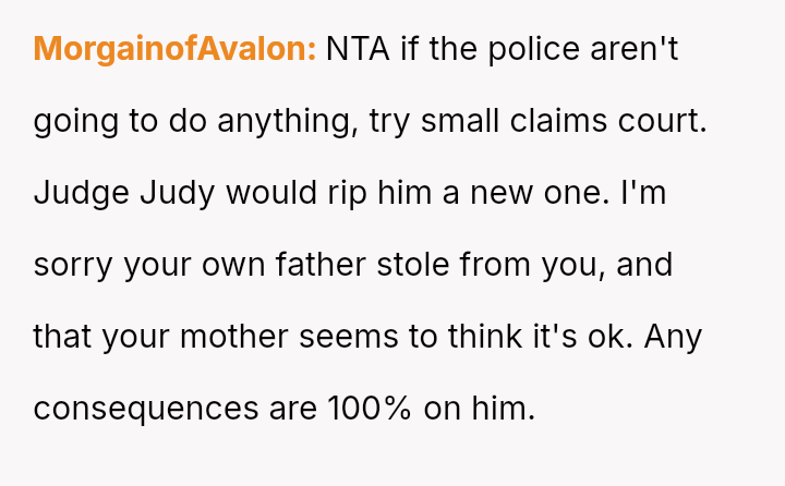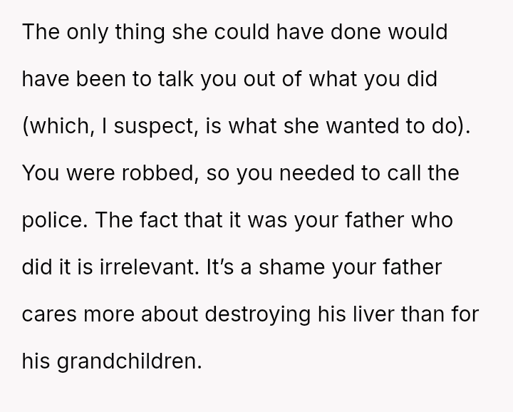 Was the OP justified in prioritizing the recovery of her son's funds and holding her father accountable through legal channels immediately, or should she have first consulted her mother to attempt an informal resolution, given the potential devastating impact a theft charge could have on her parents' lives?