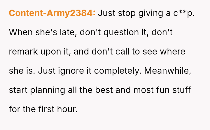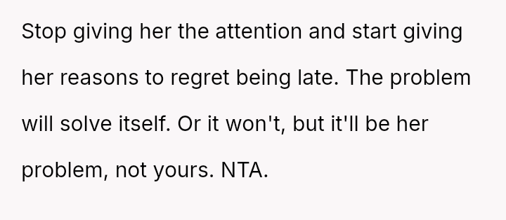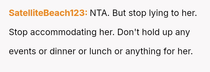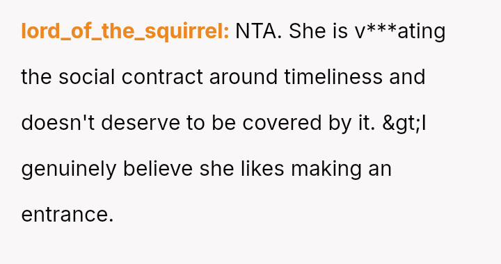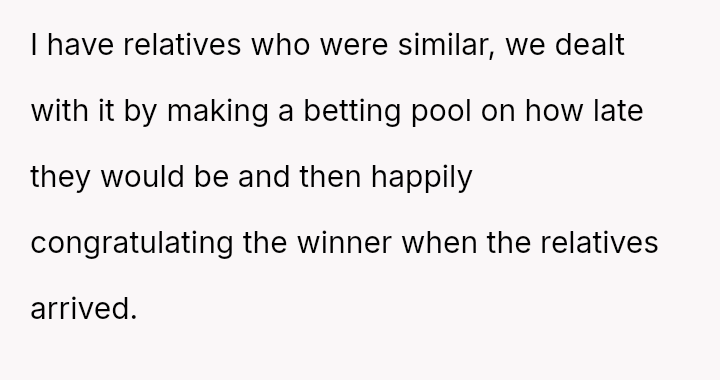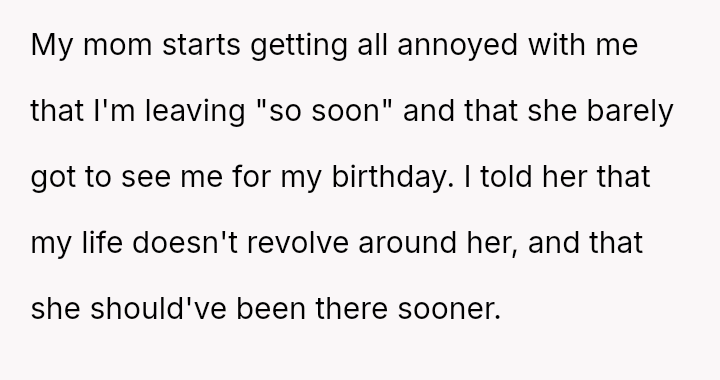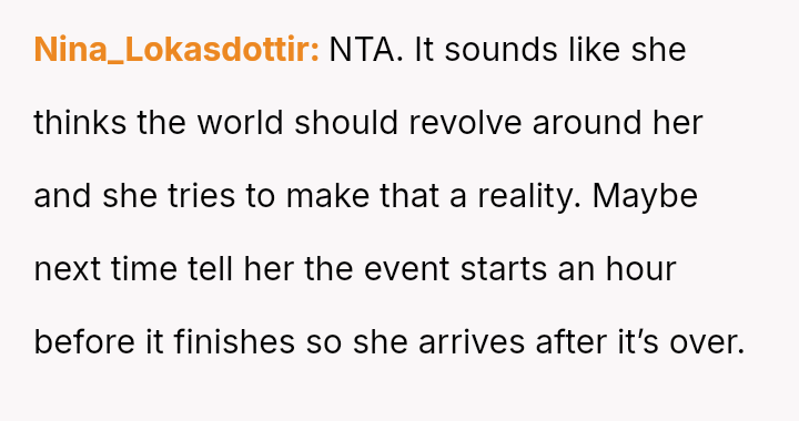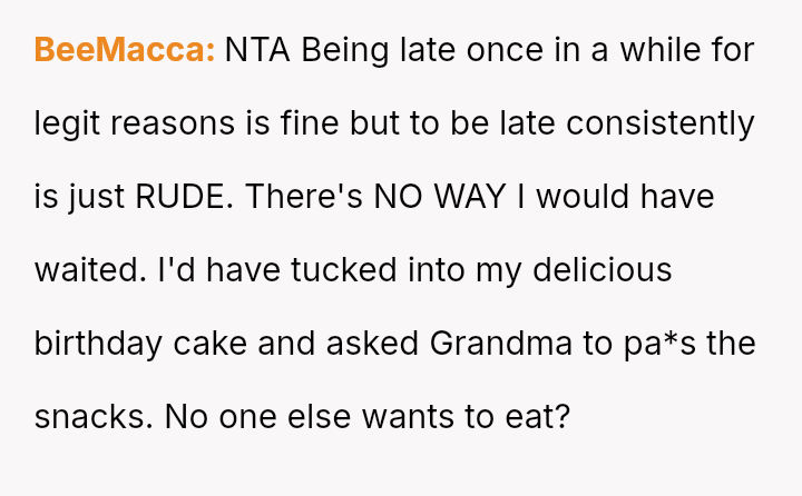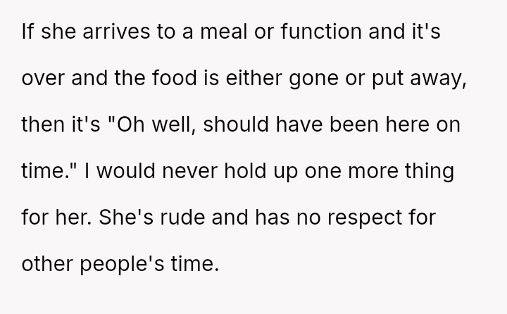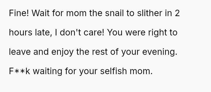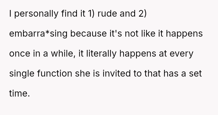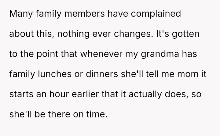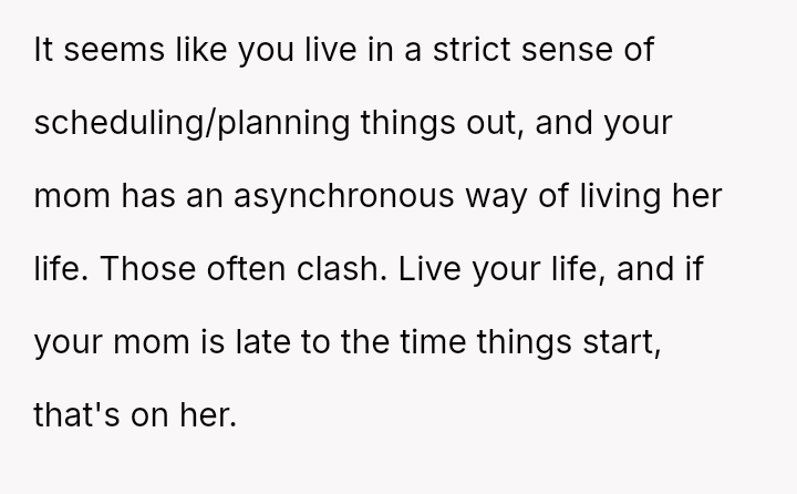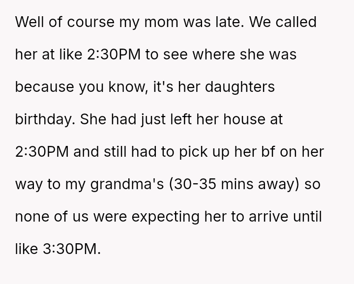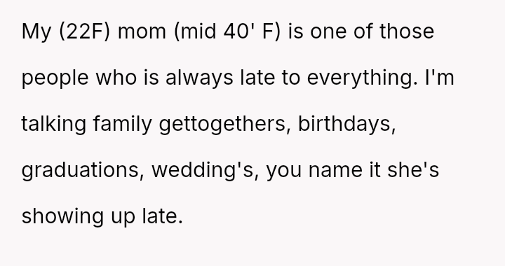 The original poster (OP) is dealing with the persistent issue of their mother habitually arriving very late to important events, causing the OP embarra*sment and disrupting plans, especially on their own birthday.
