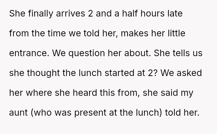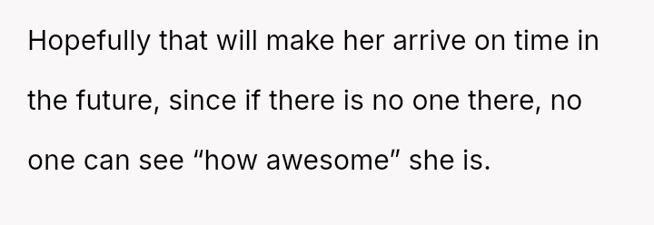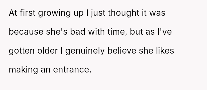 But as the years pa*sed, it became clear that her mother’s late arrivals were more than just bad timing—they were deliberate entrances, a pattern that cast a shadow over every family event and chipped away at her sense of respect and pride.
