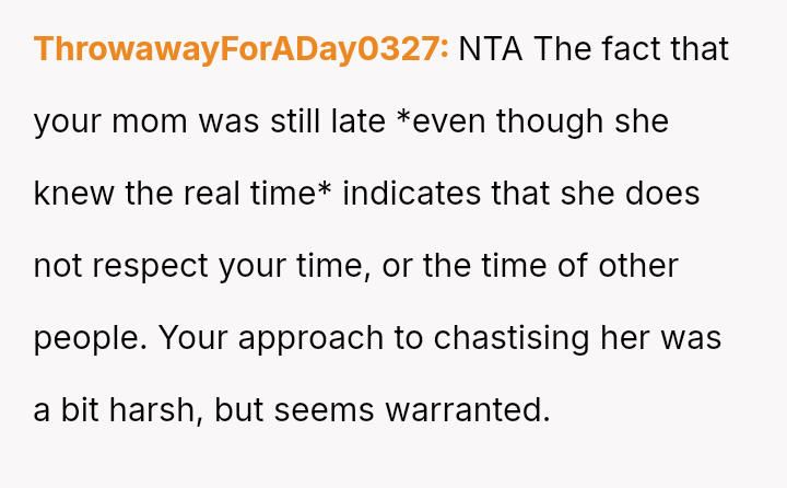 Did the OP act inappropriately by lying about the start time to secure their mother's timely arrival for a significant event, or was this a necessary, justifiable tactic given years of repeated disrespect and failure to change the mother's pattern of behavior?