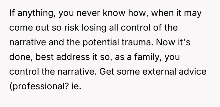 When a foundational family agreement about secrecy is broken due to emotional retaliation, is the immediate need for honesty more important than protecting the child from painful past truths, and who ultimately bears the responsibility for managing the emotional fallout of past parental decisions?
