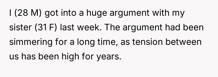 The central conflict lies between his feeling that the truth needed to be acknowledged versus his sister's expectation that the past arrangement remain hidden to preserve her current role as a mother.