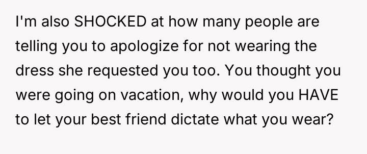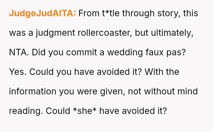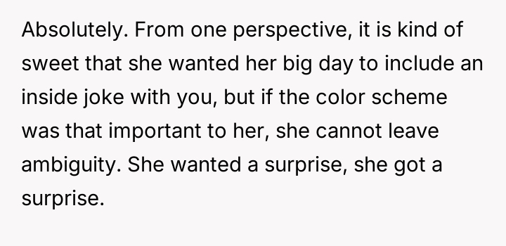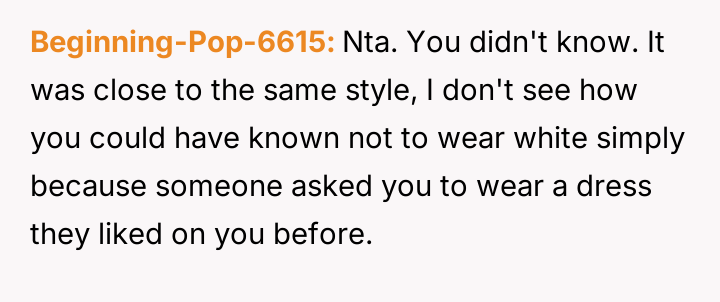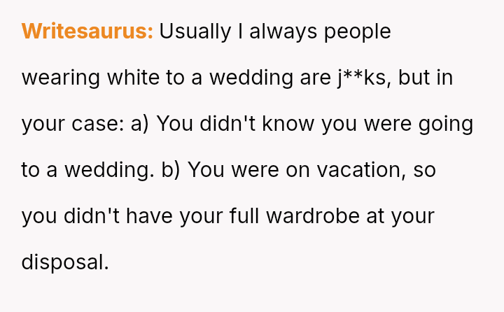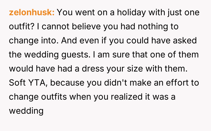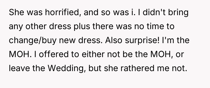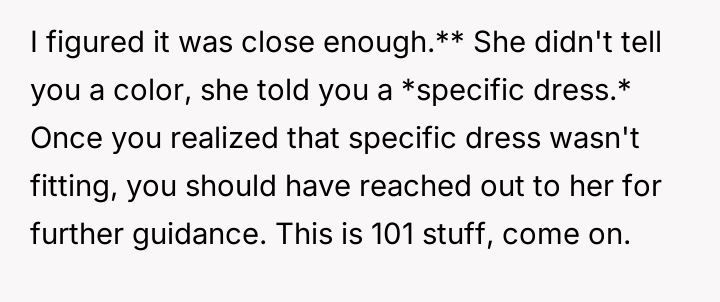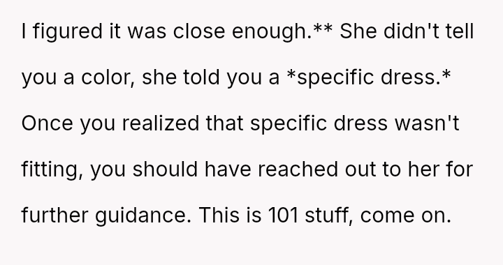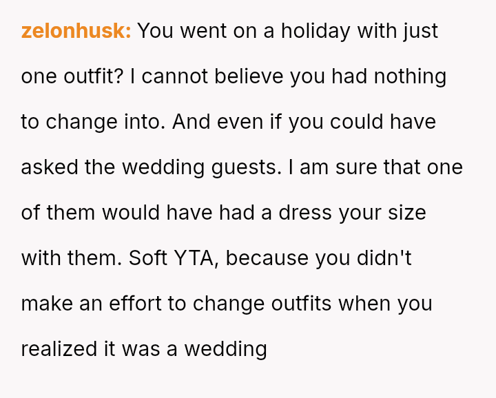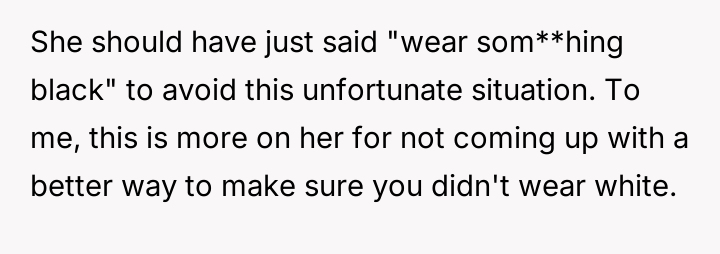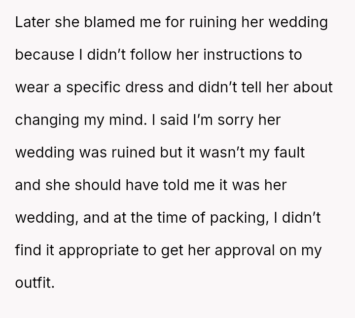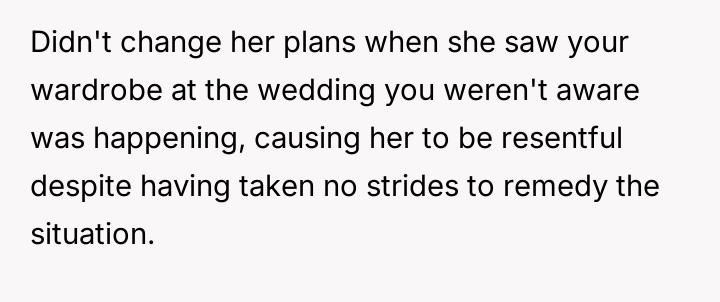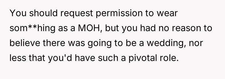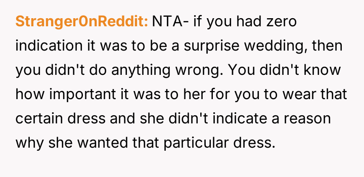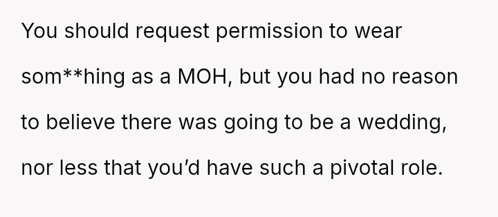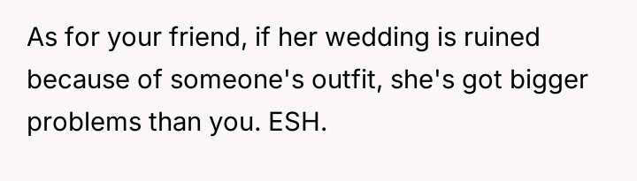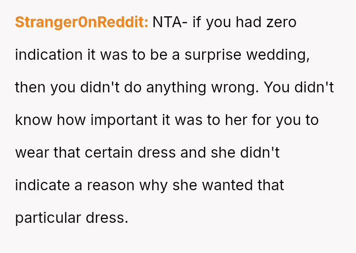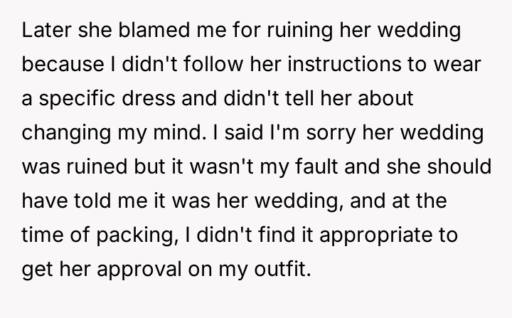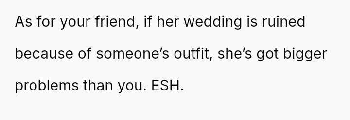Given that the OP's friend chose to keep the event a secret while simultaneously imposing a strict dress code for a major life event, whose responsibility was the resulting wardrobe failure: the friend who withheld crucial information, or the OP who made an understandable, last-minute subst*tution? Which party holds the greater accountability for the resulting distress at the wedding?