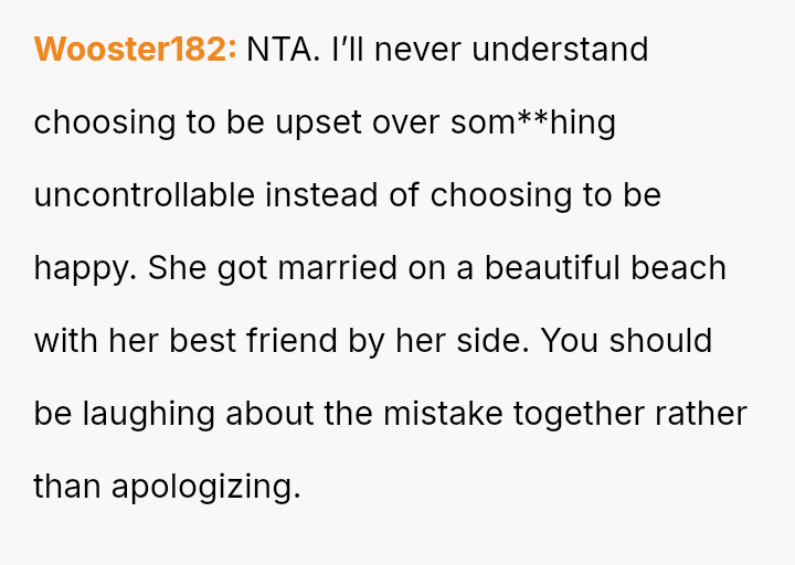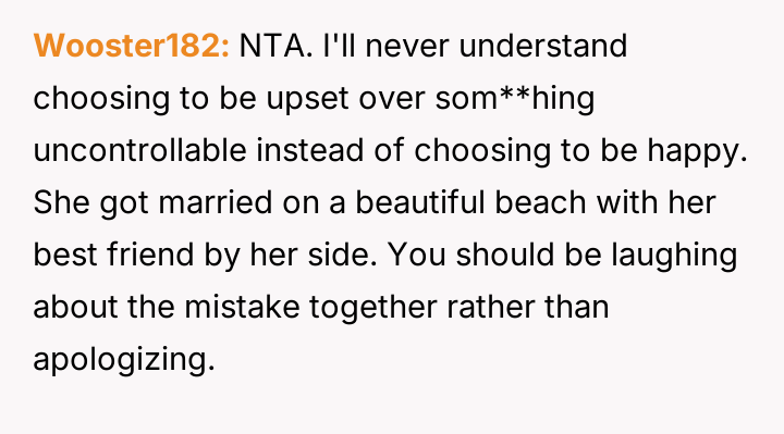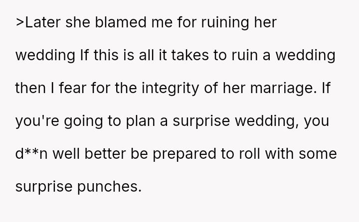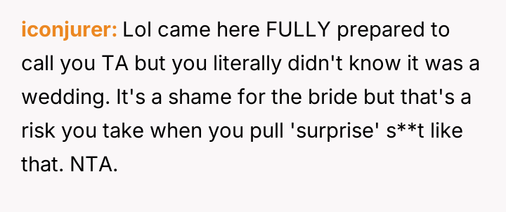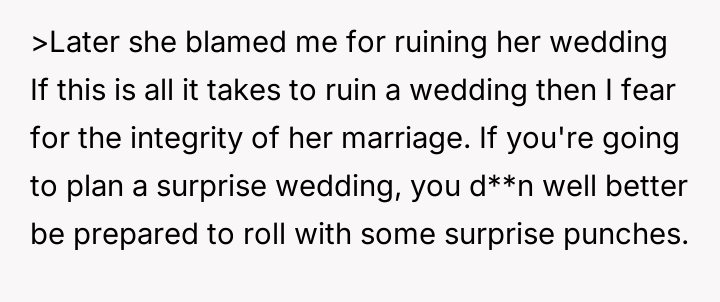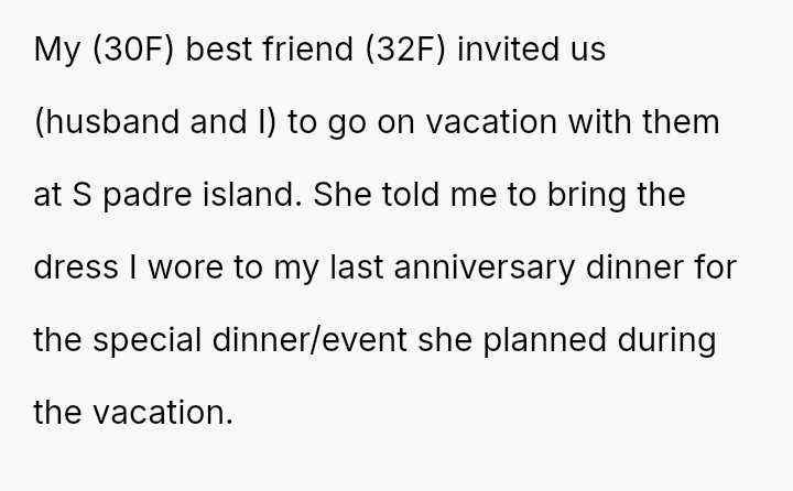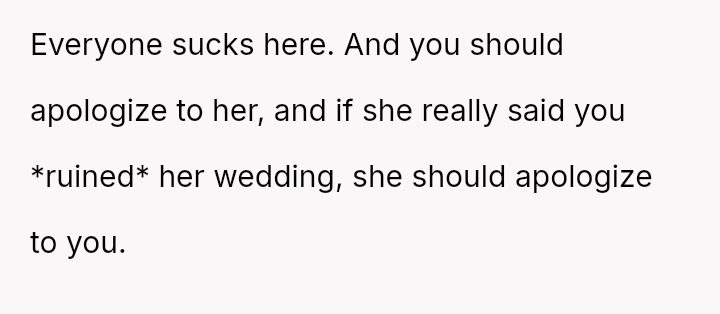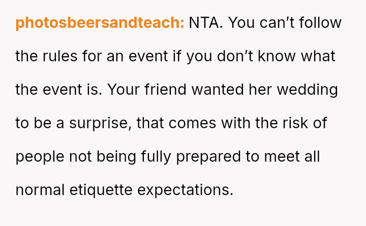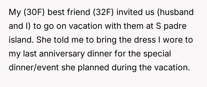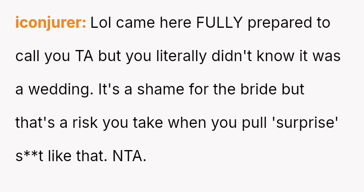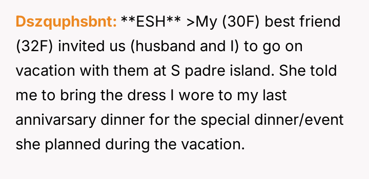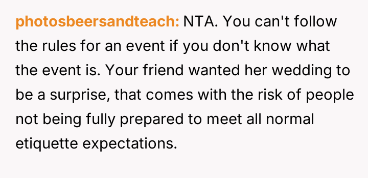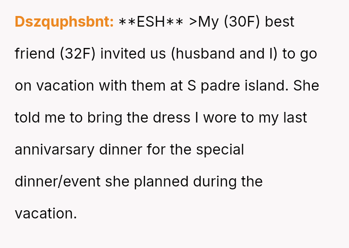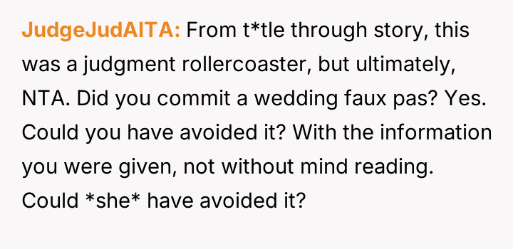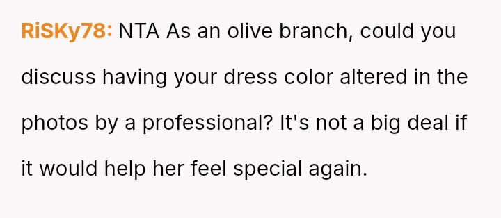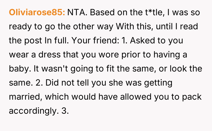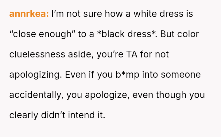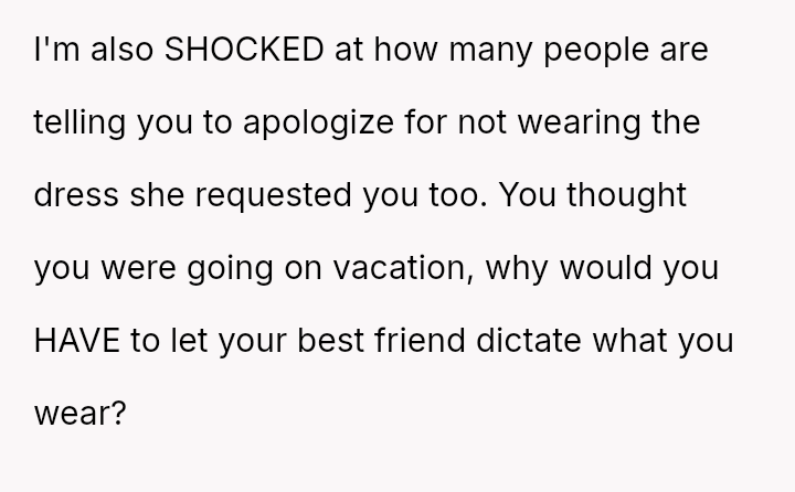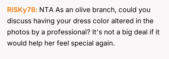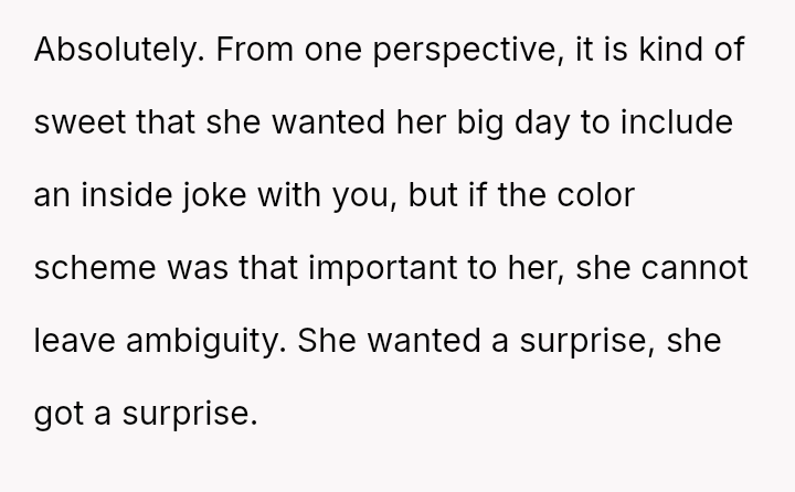 Given that the OP's friend chose to keep the event a secret while simultaneously imposing a strict dress code for a major life event, whose responsibility was the resulting wardrobe failure: the friend who withheld crucial information, or the OP who made an understandable, last-minute subst*tution? Which party holds the greater accountability for the resulting distress at the wedding?