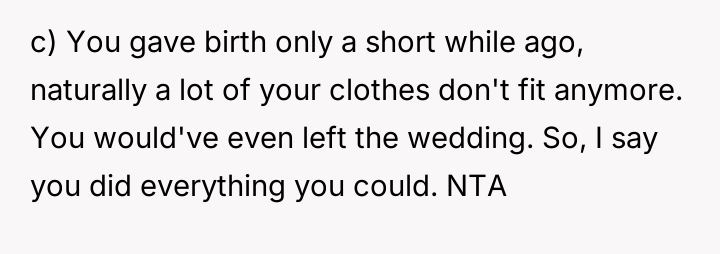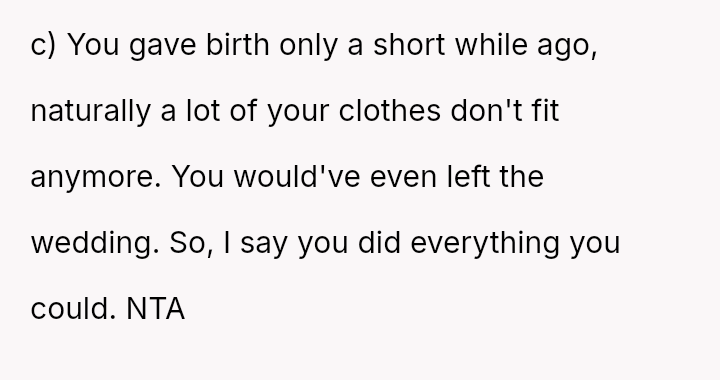 The original poster (OP) is caught between honoring her best friend's surprise wedding expectations and acknowledging her own physical realities following childbirth.