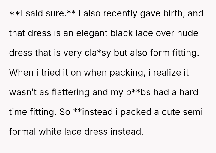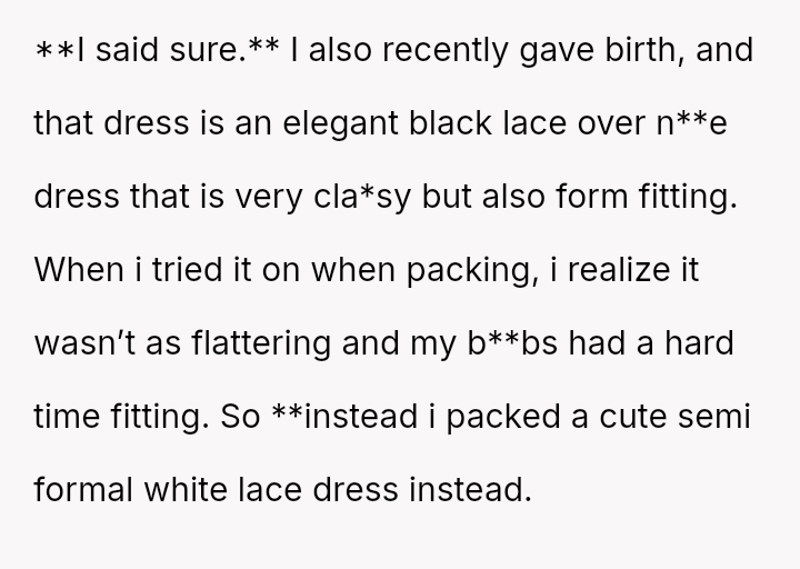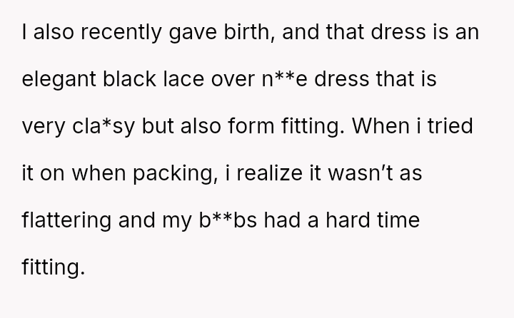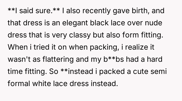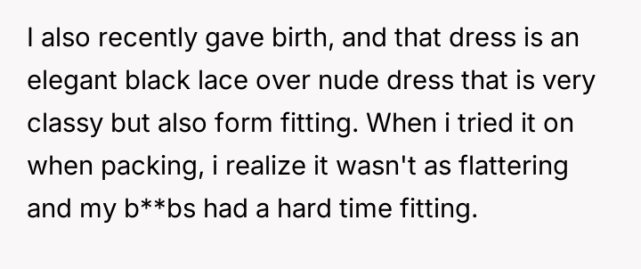 The weight of unspoken expectations and the pressure of appearances pressed heavily on her heart, as the elegant black lace dress she planned to wear no longer fit, and her subst*tute dress felt painfully inadequate.