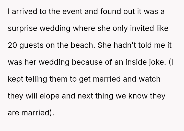 A new mother, still adjusting to the changes of her body, found herself caught unprepared at what she thought was a special dinner, only to discover it was a secret wedding—her best friend’s wedding—held in an intimate gathering she never expected.