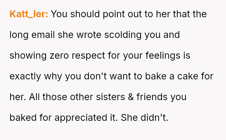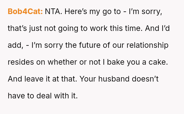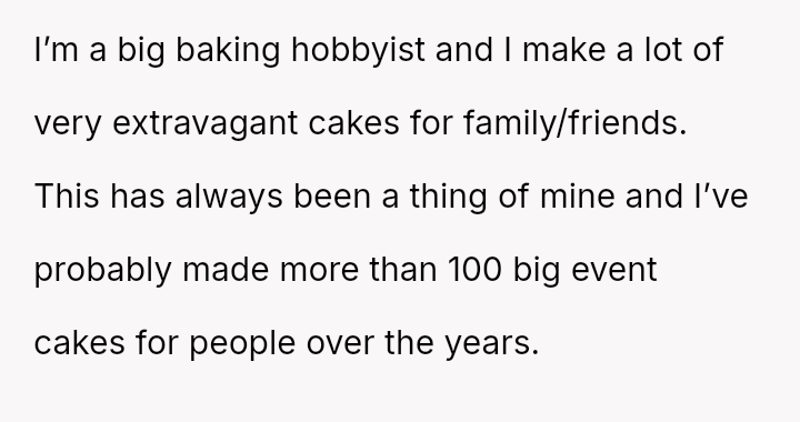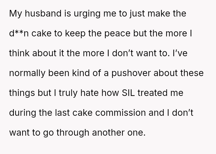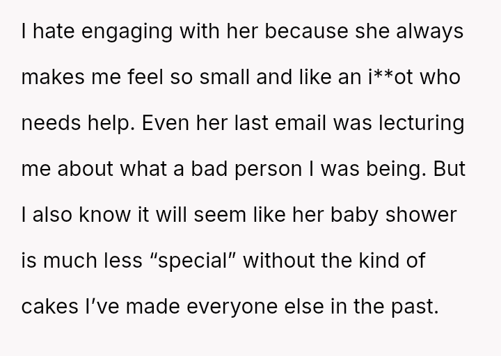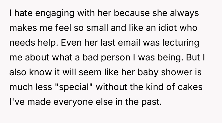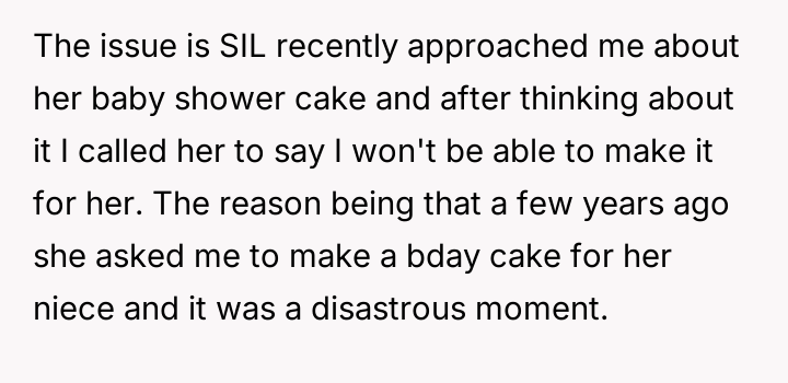 The original poster (OP) is caught between honoring a deeply negative past experience with their sister-in-law (SIL) regarding a high-stress baking request and the family expectation to provide a special, custom cake for the upcoming baby shower.