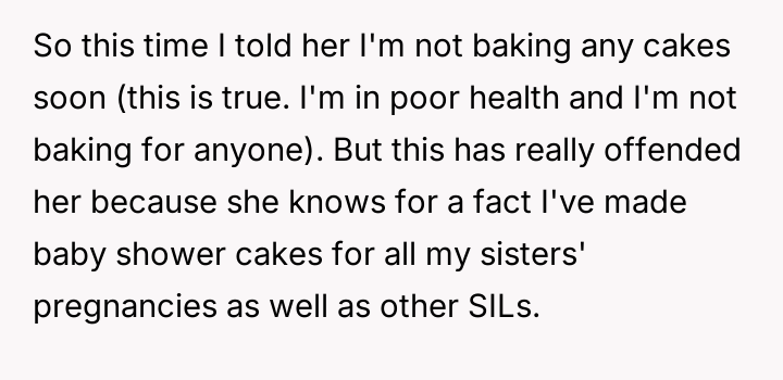 AITA for refusing to bake my pr****nt SIL a baby shower cake even though I’ve baked cakes for all my other sisters/SILs?