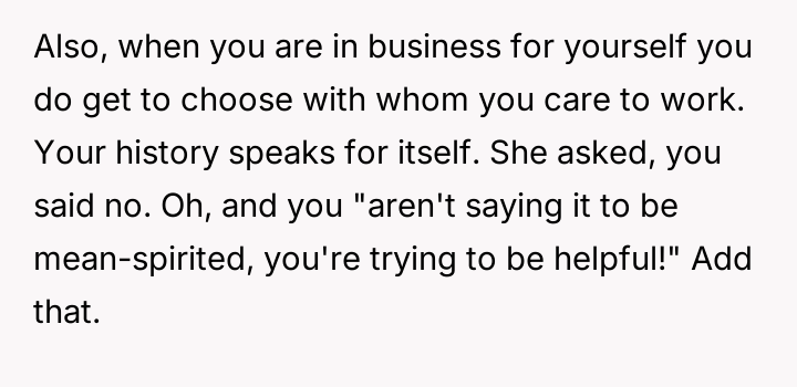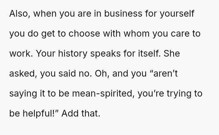 The OP's current decision to refuse is rooted in self-preservation after feeling micromanaged and emotionally attacked during a prior interaction, leading to a conflict with the SIL's expectation of receiving the same free, elaborate service as other family members.