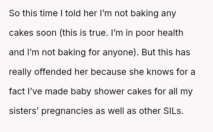 Given the history of painful micromanagement and the OP's current health constraints, is the OP justified in prioritizing their mental well-being and declining the baking request, or should they comply with family pressure to ensure the SIL's baby shower feels as 'special' as the others?