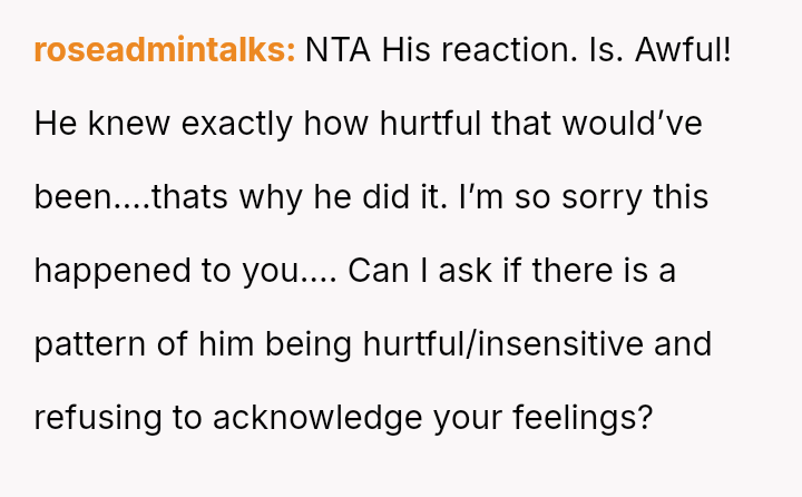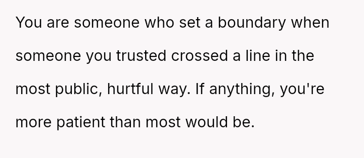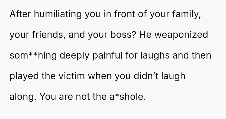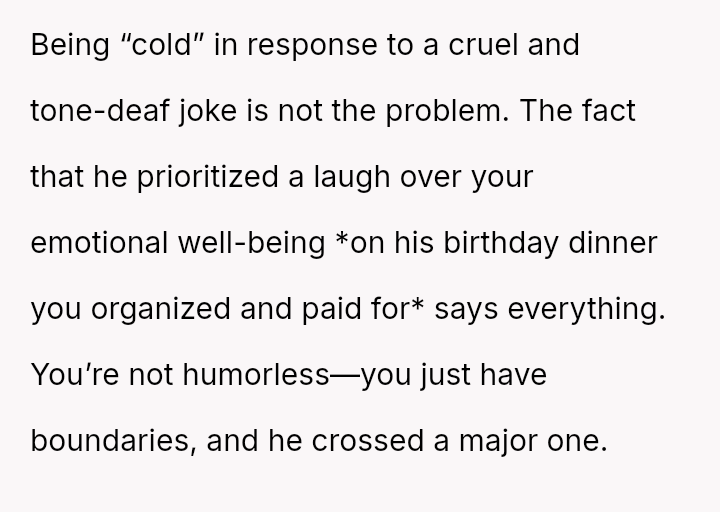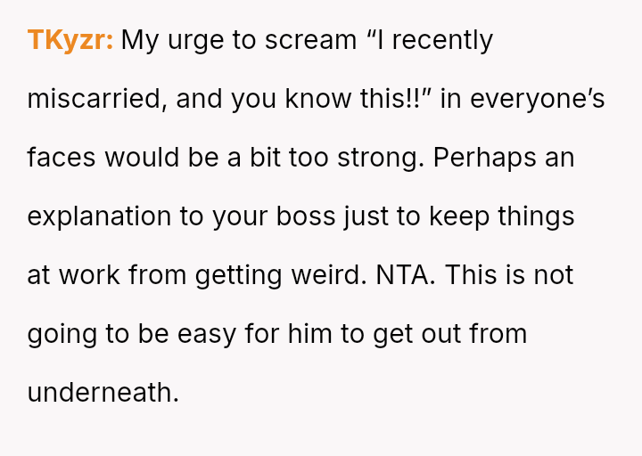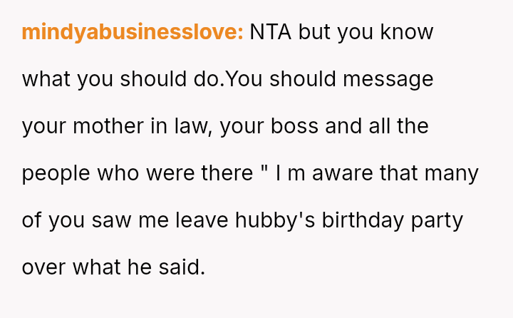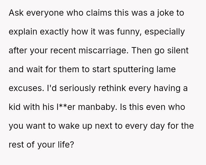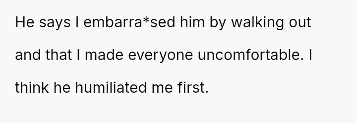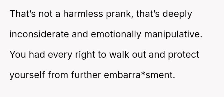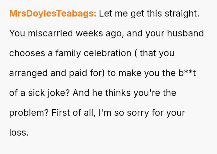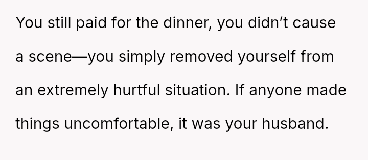 Her reaction was to remove herself from the situation, but this has resulted in her husband and his family criticizing her for being cold and overreacting to what they call a "harmless joke." The core conflict is whether the husband’s public, insensitive announcement about pregnancy—especially given the OP's past miscarriage—justified her immediate departure, or if her walking out const*tuted an overreaction that ruined his birthday celebration.