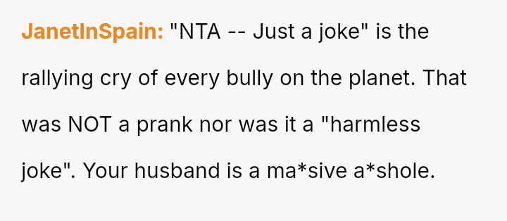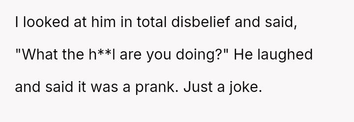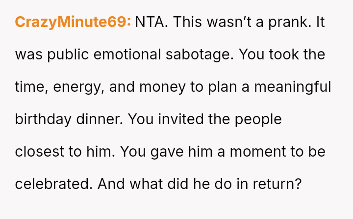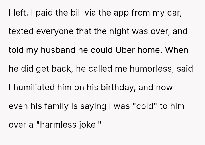 When the OP reacted with shock and confronted him, he dismissed it as a "prank," leading her to immediately leave the restaurant after paying the bill and telling everyone the event was over, leaving her husband to find his own ride home, which now has led to him accusing her of ruining his birthday and embarra*sing him.