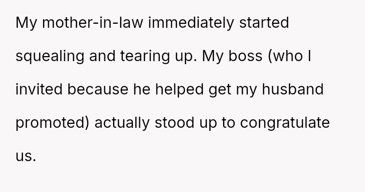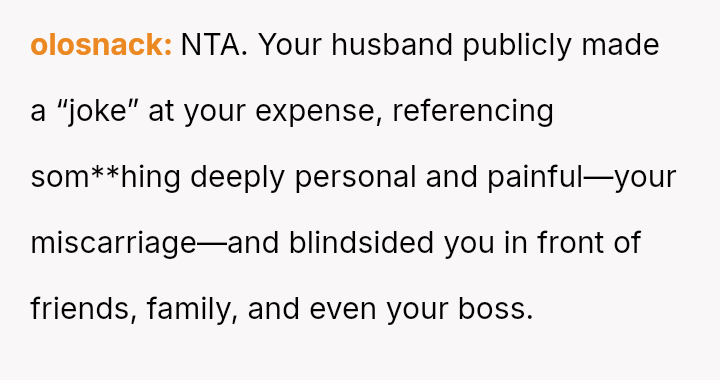 During the dinner, while the OP was giving a short toast praising her husband's work achievement, he interrupted her to announce, falsely, that she was pr****nt, knowing she was sensitive about the topic after a miscarriage in March.