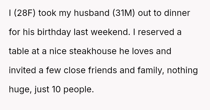 The user, a 28-year-old female (OP), organized a special birthday dinner for her 31-year-old husband at a nice steakhouse, inviting ten close friends and family members, and she paid for the entire event herself.