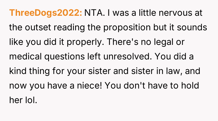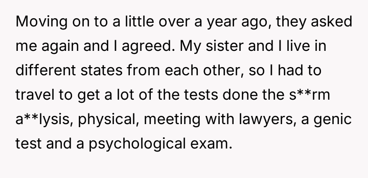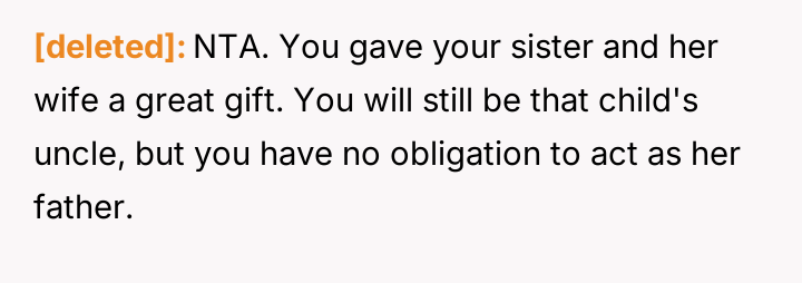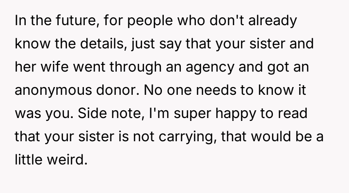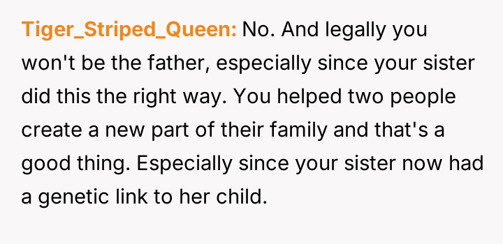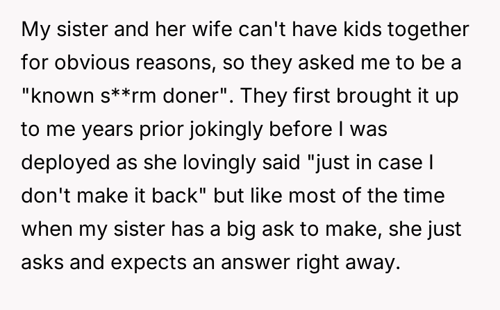 The original poster (OP) entered into an agreement to be a s**rm donor for his sister and her wife, fully aware of the implications, yet he now expresses a strong aversion to having any parental role or emotional attachment to the resulting child.