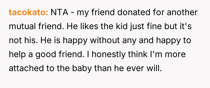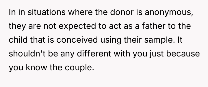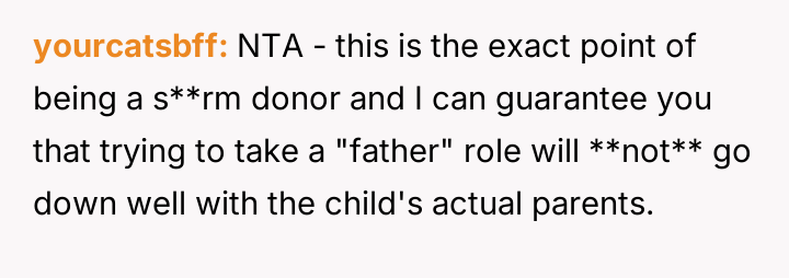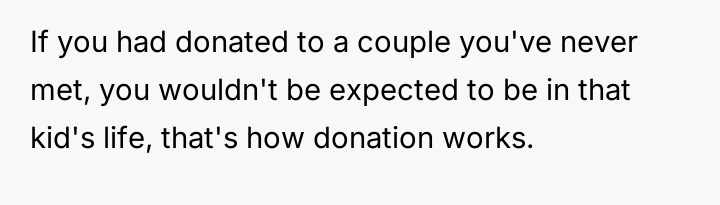 Given the OP's clear personal boundaries regarding fatherhood versus the biological connection es**blished through donation, is he justified in refusing any father-figure role, or does the magnitude of his contribution create an unavoidable responsibility that overrides his personal comfort levels?
