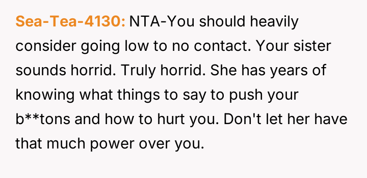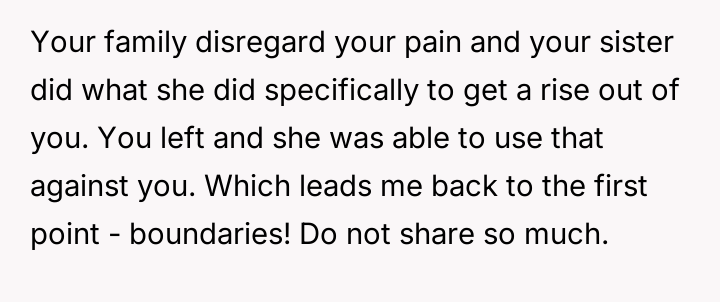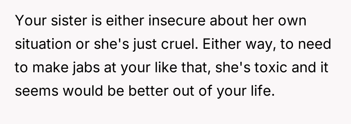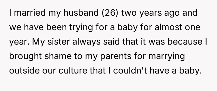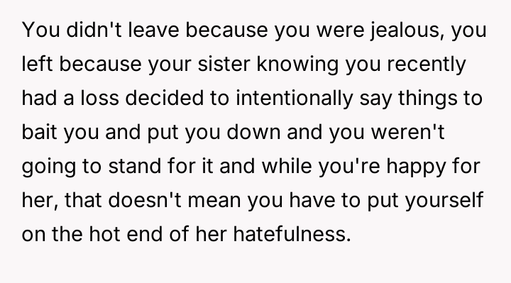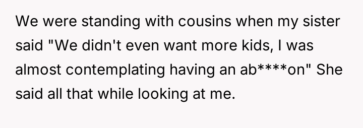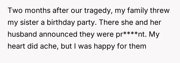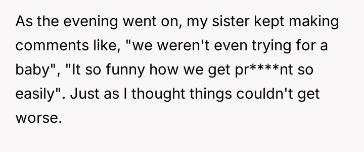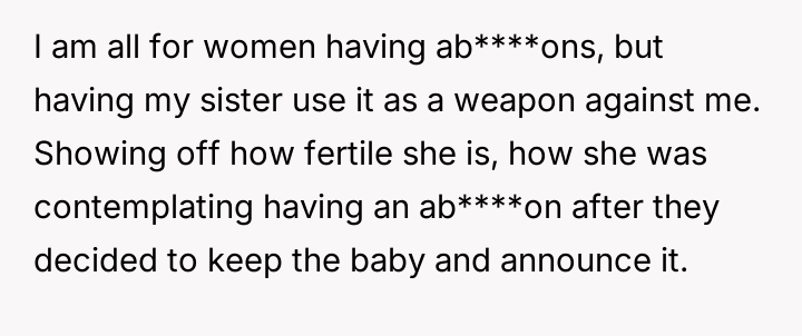 The central conflict arises when the sister intentionally uses her subsequent, easy pregnancy announcement to weaponize the OP's recent trauma and infertility struggles, leading the OP to leave a family event in distress.