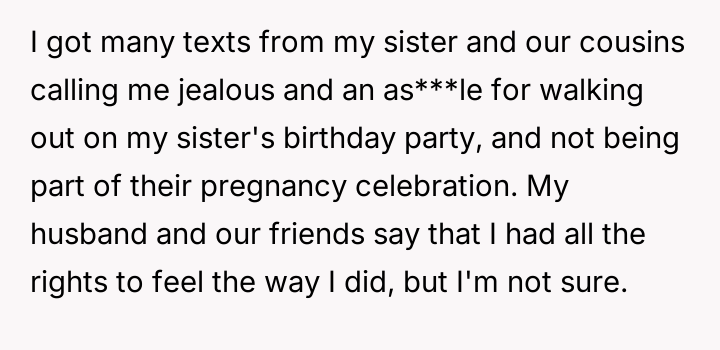 AITA for walking out of my sister's birthday party after she announced she was pr****nt?