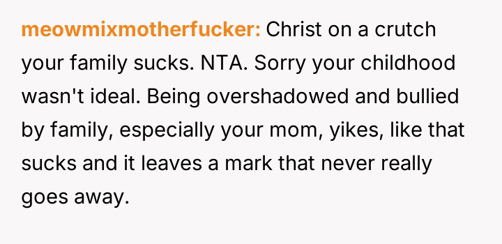 The original poster (OP) is dealing with deep-seated resentment stemming from a long history of sibling rivalry and parental favoritism, which was severely exacerbated by a recent mis*****age.